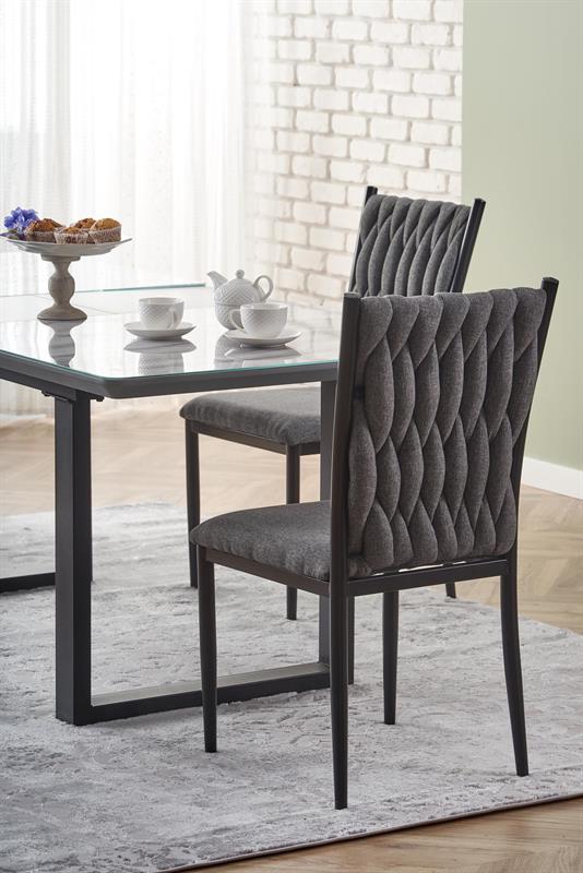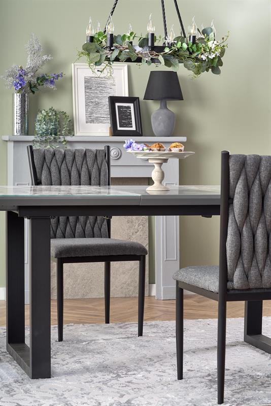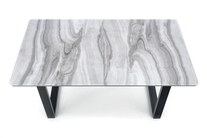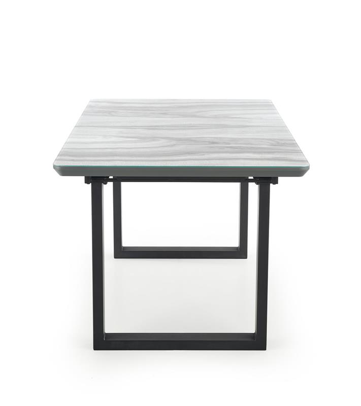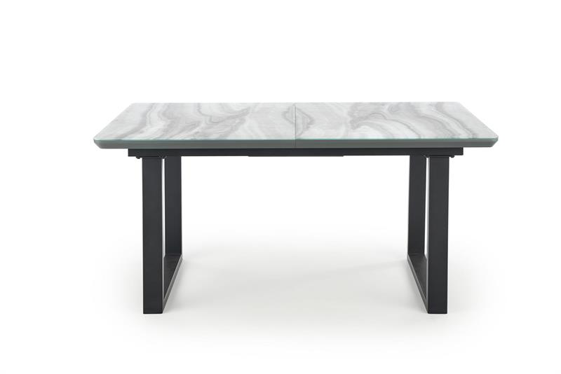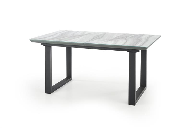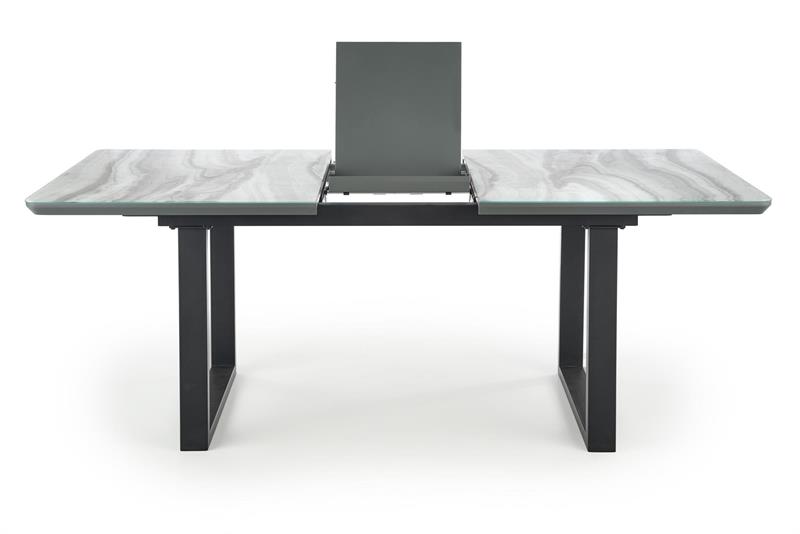 Prailginamas stalas, matmenys: 160-200/90/76 cm, medžiaga: stiklas / lakuota MDF / milteliniu būdu dažytas plienas, spalva: stalviršis – baltas marmuras / pilka, kojos – juodos