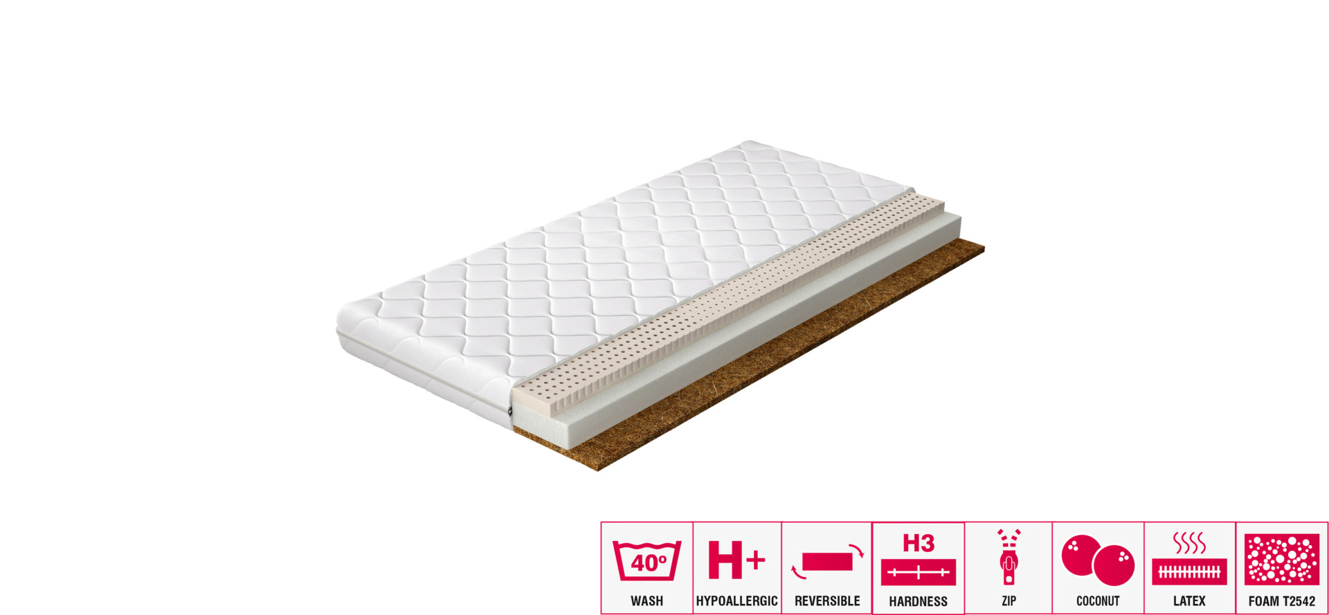 Dažnai nesusimąstome, koks svarbus yra sveikas stuburas. Tirpimas, kojų ir rankų skausmas, galvos skausmai – tai tik keletas negalavimų, kuriuos sukelia stuburo problemos. Jų galima išvengti mankštinantis arba pasirinkus tinkamą čiužinį. „Mokka“ latekso čiužinys – mūsų atsakas į jūsų poreikius. Pagamintas iš aukščiausios kokybės medžiagų, storas latekso putų sluoksnis ir lankstus T2542 putplastis kartu su kokoso pluošto plokšte puikiai pagerina miego kokybę, o visa tai su nuimamu užvalkalu.