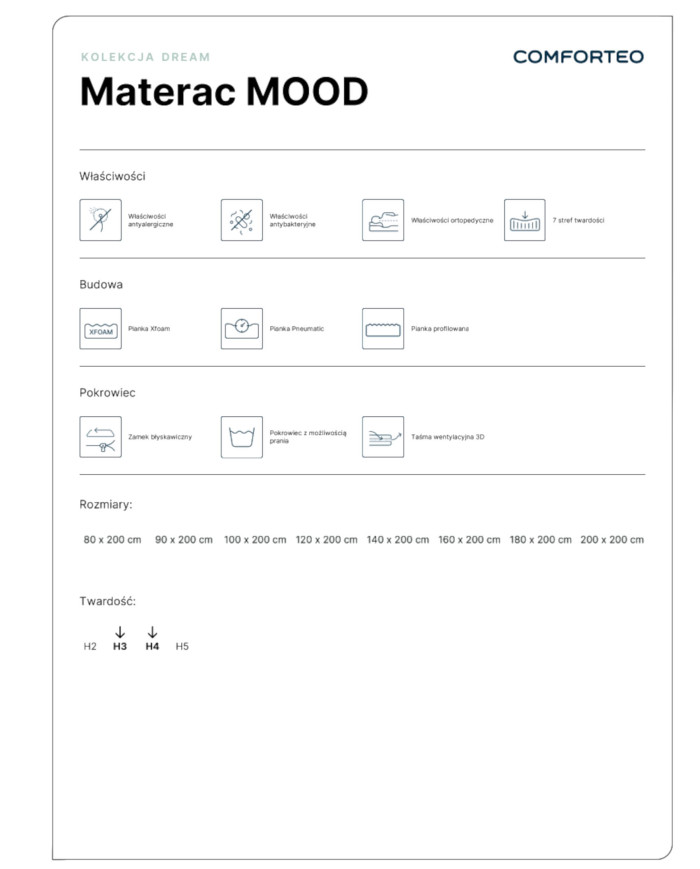 „Mood“ čiužinys, 140 x 200 cm, dvipusis, putų poliuretanas, pneumatinės ir „Xfoam“ putos, nuimamas užvalkalas, H3/H4, „Comforteo“