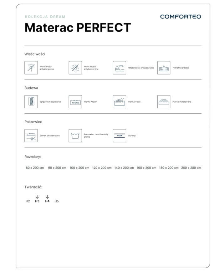 „Perfect 80×200 cm“ čiužinys – tai modernus modelis, užtikrinantis aukštą stuburo padėtį ir išskirtinį miego komfortą. Dėl 7 kietumo zonose išdėstytų kišeninių spyruoklių naudojimo čiužinys garantuoja optimalią stuburo atramą, prisitaikydamas prie kūno formos per visą ilgį. Kiekviena spyruoklė veikia nepriklausomai, todėl idealiai tinka poroms ir tiems, kurie miegodami dažnai keičia padėtį. Papildomas privalumas – „Visco“ putos, kurios reaguoja į kūno temperatūrą ir prisitaiko prie jo formos, apglėbia siluetą ir pagerina komfortą. Tuo tarpu novatoriška „XFoam“ technologija padidina čiužinio elastingumą ir ilgaamžiškumą, todėl jis atsparus deformacijai.