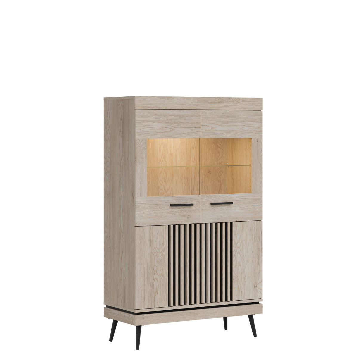 Žema vitrina MI06 yra elegantiškas ir funkcionalus baldas, kuris papildo bet kokį interjerą, suteikdamas jam stiliaus ir klasės. Dėl kompaktiško dizaino ji idealiai tinka laikyti įvairius daiktus, tokius kaip knygos, dekoracijos, elektronika ir namų aksesuarai, neužimant erdvės. Įrengta įvairių lentynų, stalčių ir durelėmis, ji leidžia praktiškai valdyti erdvę ir lengvai pasiekti laikomus daiktus. Papildomas privalumas yra foninio apšvietimo galimybė, o stiklinės durelėmis ji suteikia interjerui elegancijos ir modernumo, tapdama ne tik praktišku, bet ir dekoratyviniu elementu.
