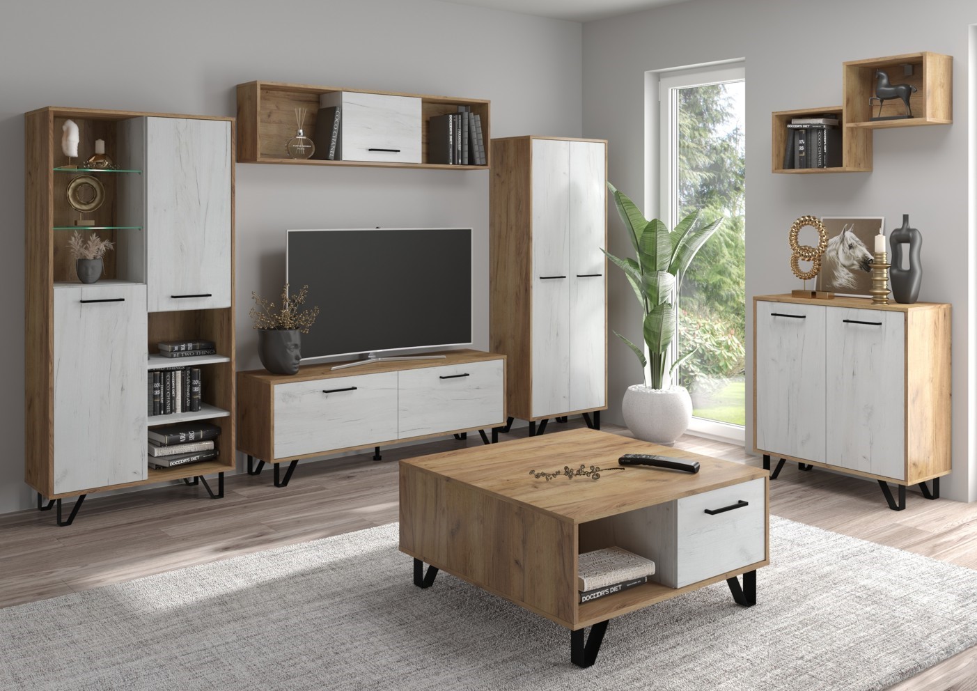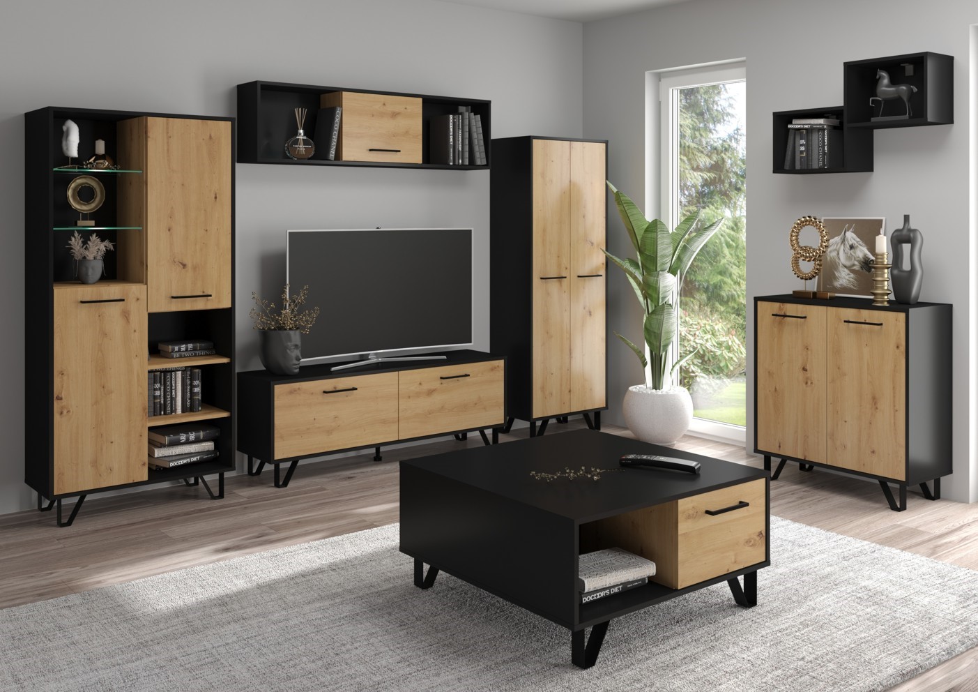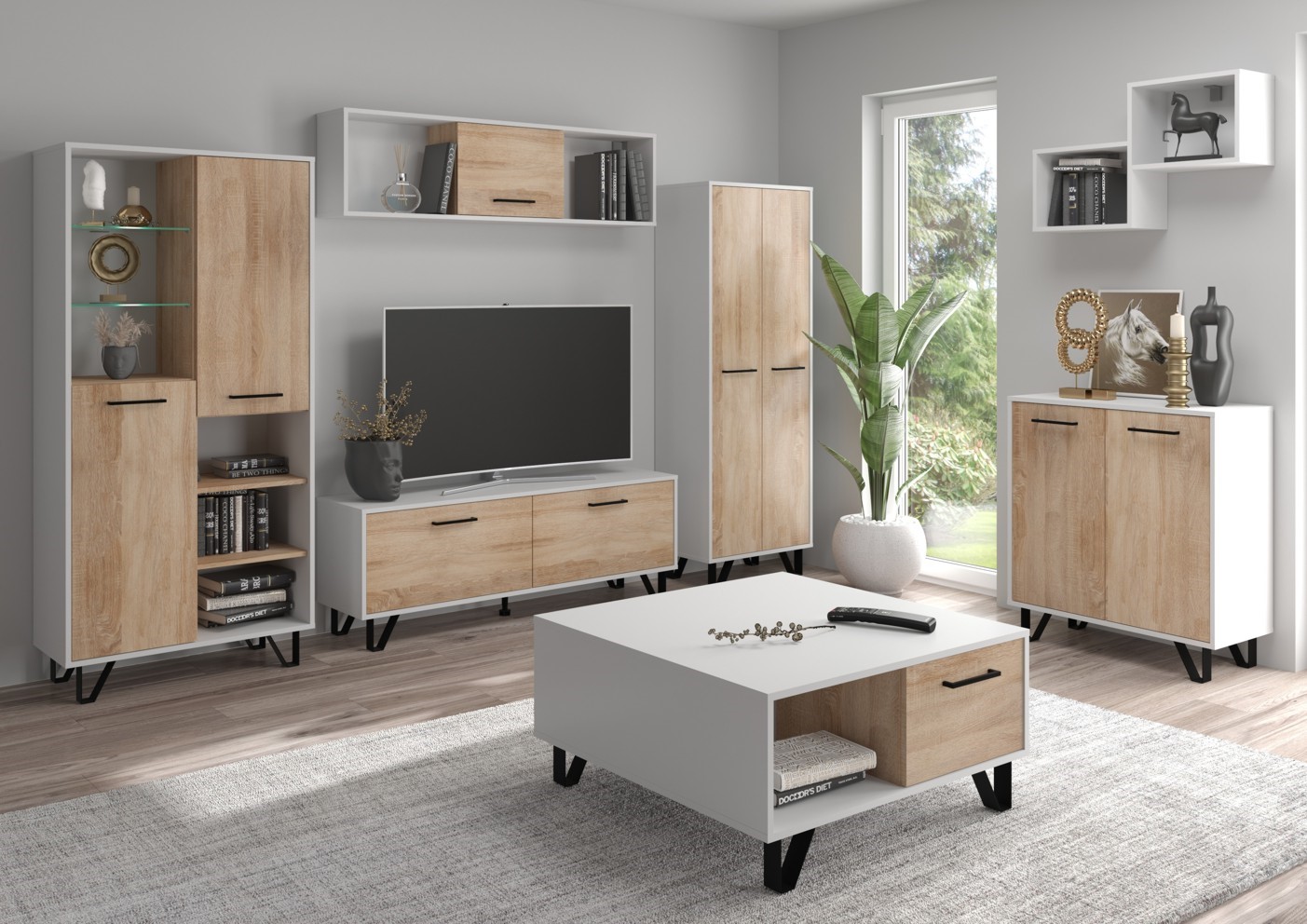 Komplektą sudaro: BIP 09 dviejų durų knygų lentyna [80/170/39], BIP 12 televizoriaus staliukas [140/50/39], BIP 16 vienų durų sieninė spintelė [140/38/25], BIP 14 dviejų durų spinta [60/170/39], BIP 02 dviejų durų komoda [80/87/39], BIP 06 dviejų durų kavos staliukas [85/42/90], BIP 07 lentyna [80/50/23]