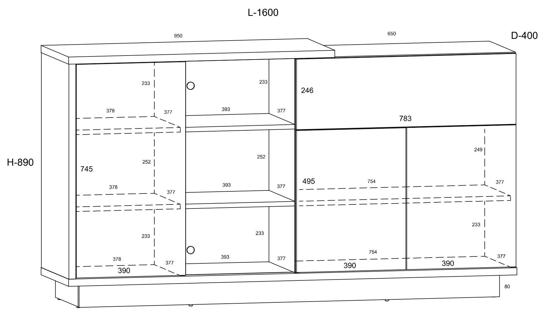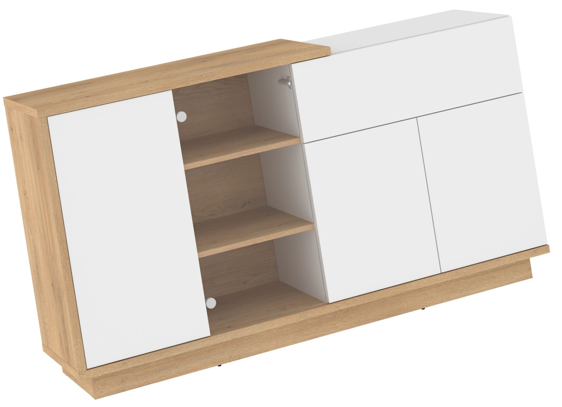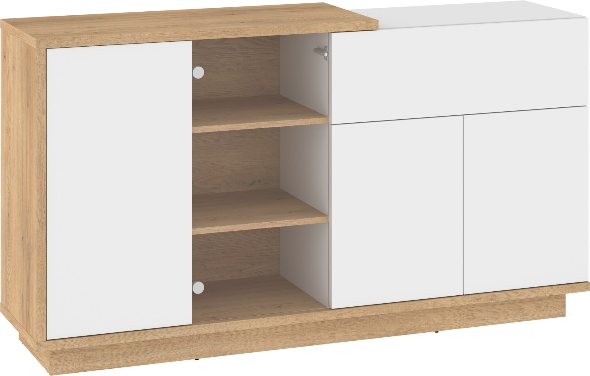 BRITA 08 baldų vitrina su stalčiumi svetainei, kremonos ąžuolas, balta blizgi spalva