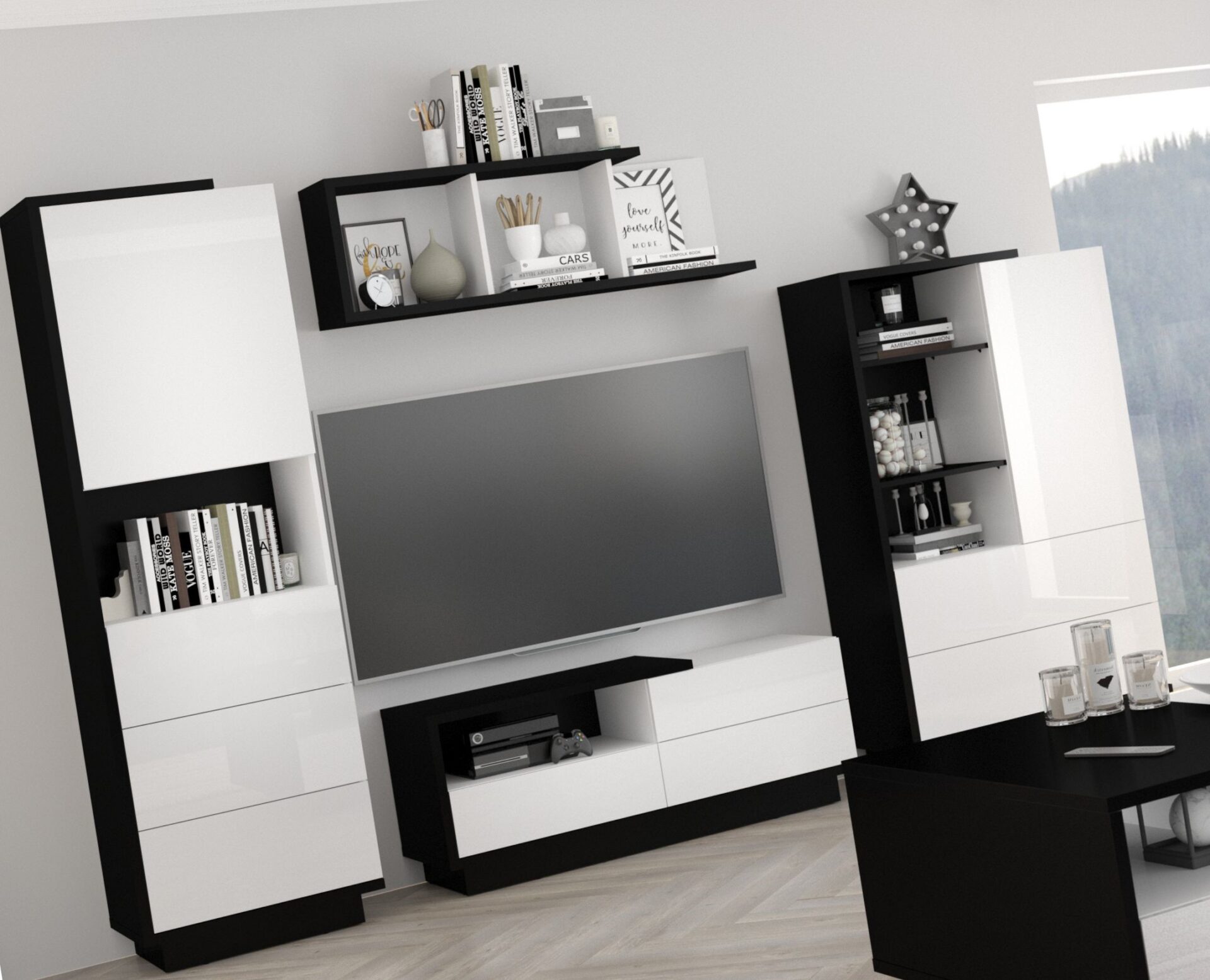 BRITA #1 svetainės baldai, TV spintelė, lentyna, juodai balta blizgi