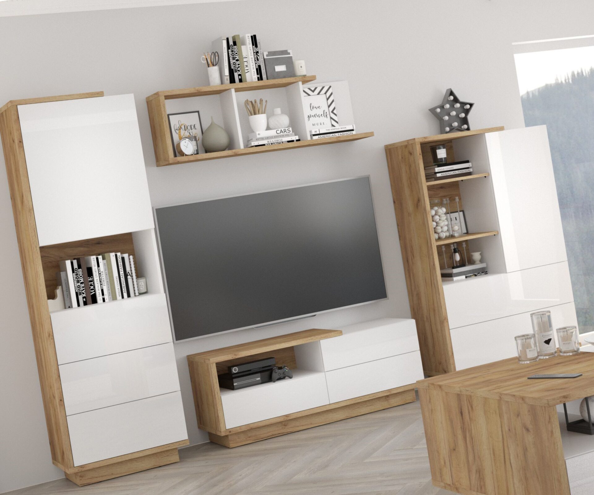 BRITA #1 svetainės baldai, TV spintelė, lentyna, ąžuolo dirbiniai, auksinė, balta blizgi spalva
