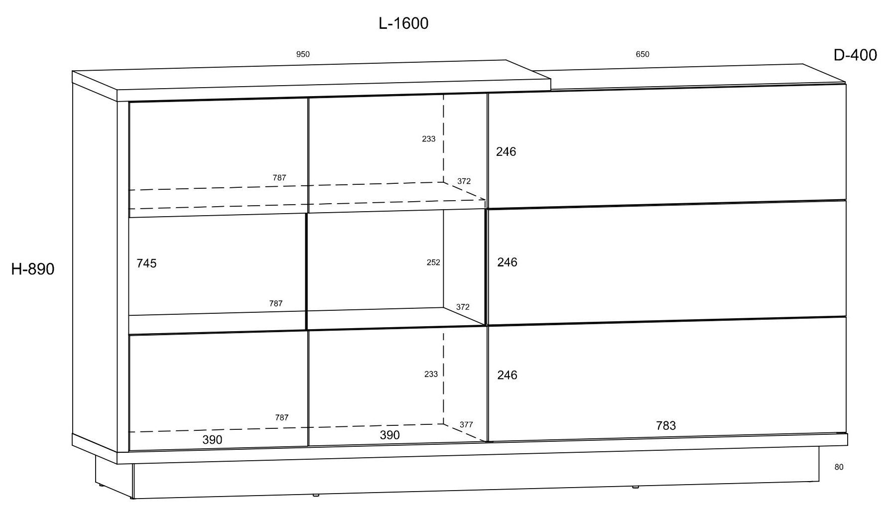 Baldai pagaminti iš 16 mm ir 25 mm storio medžio drožlių plokštės su ABS kraštais. Stalčiai ir durelės atidaromi spustelėjus. Pjedestalas yra 8,5 cm aukščio.