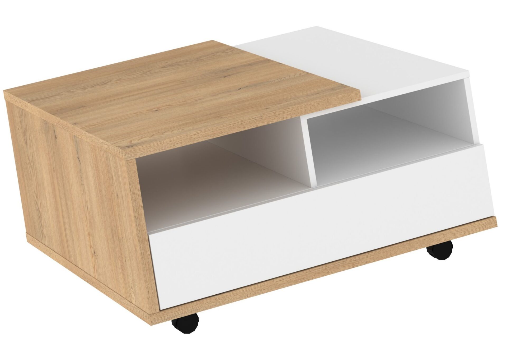BRITA 11 kavos staliukas su stalčiais, kremonos ąžuolas, blizgi balta spalva