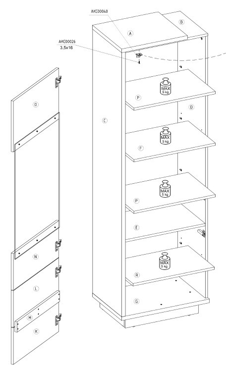 Baldai pagaminti iš 16 mm ir 25 mm storio medžio drožlių plokštės su ABS kraštais. Durys turi atidarymo mechanizmą paspaudimu. Pjedestalas yra 8,5 cm aukščio.