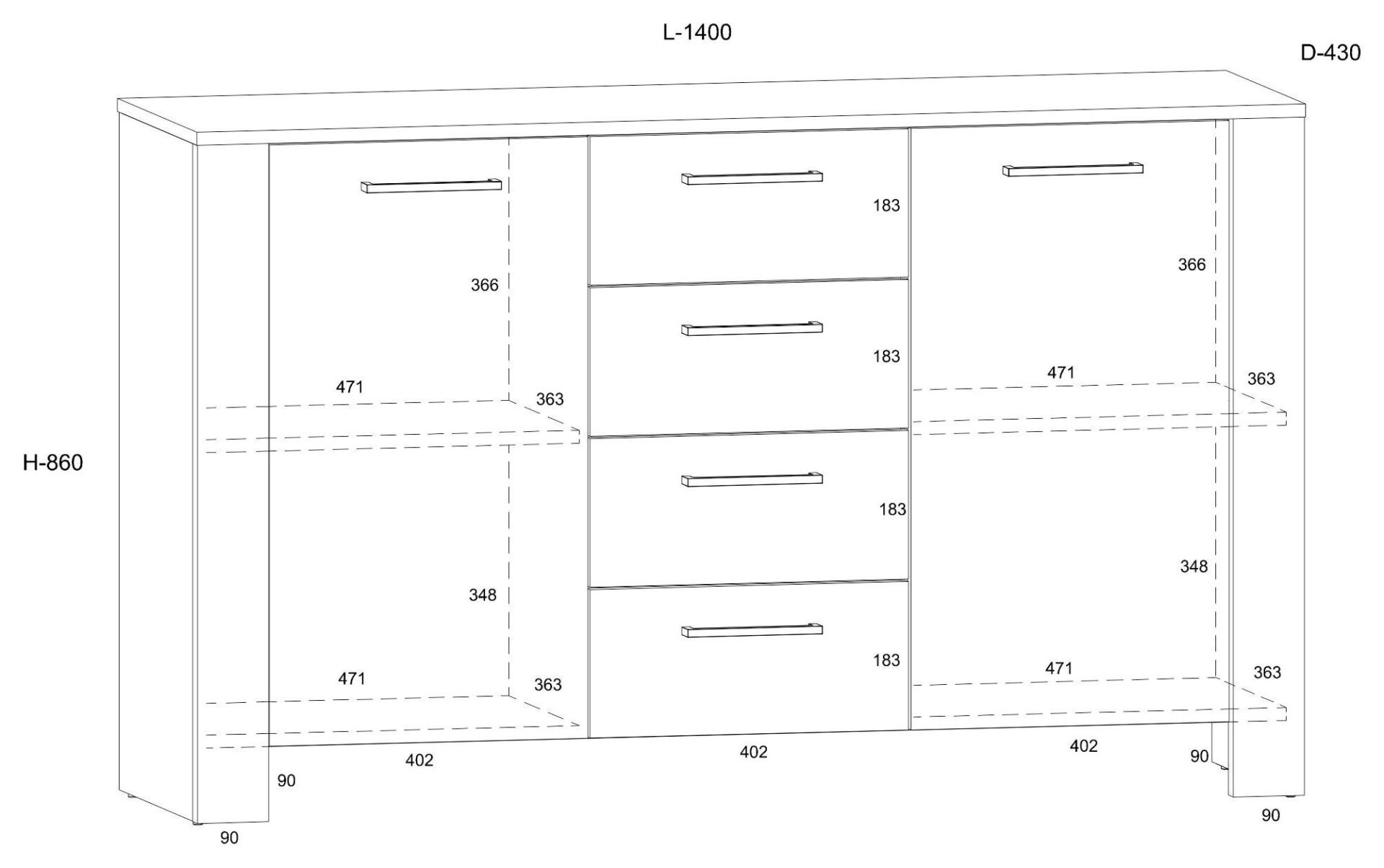 DELIS 03 komoda su durelėmis ir stalčiais svetainei. 16 mm ir 25 mm plokštė, ABS kraštas, švelnaus uždarymo sistema, PILNAI ATIDARYTOS bėgelės. Spalva: Kremonos ąžuolas.