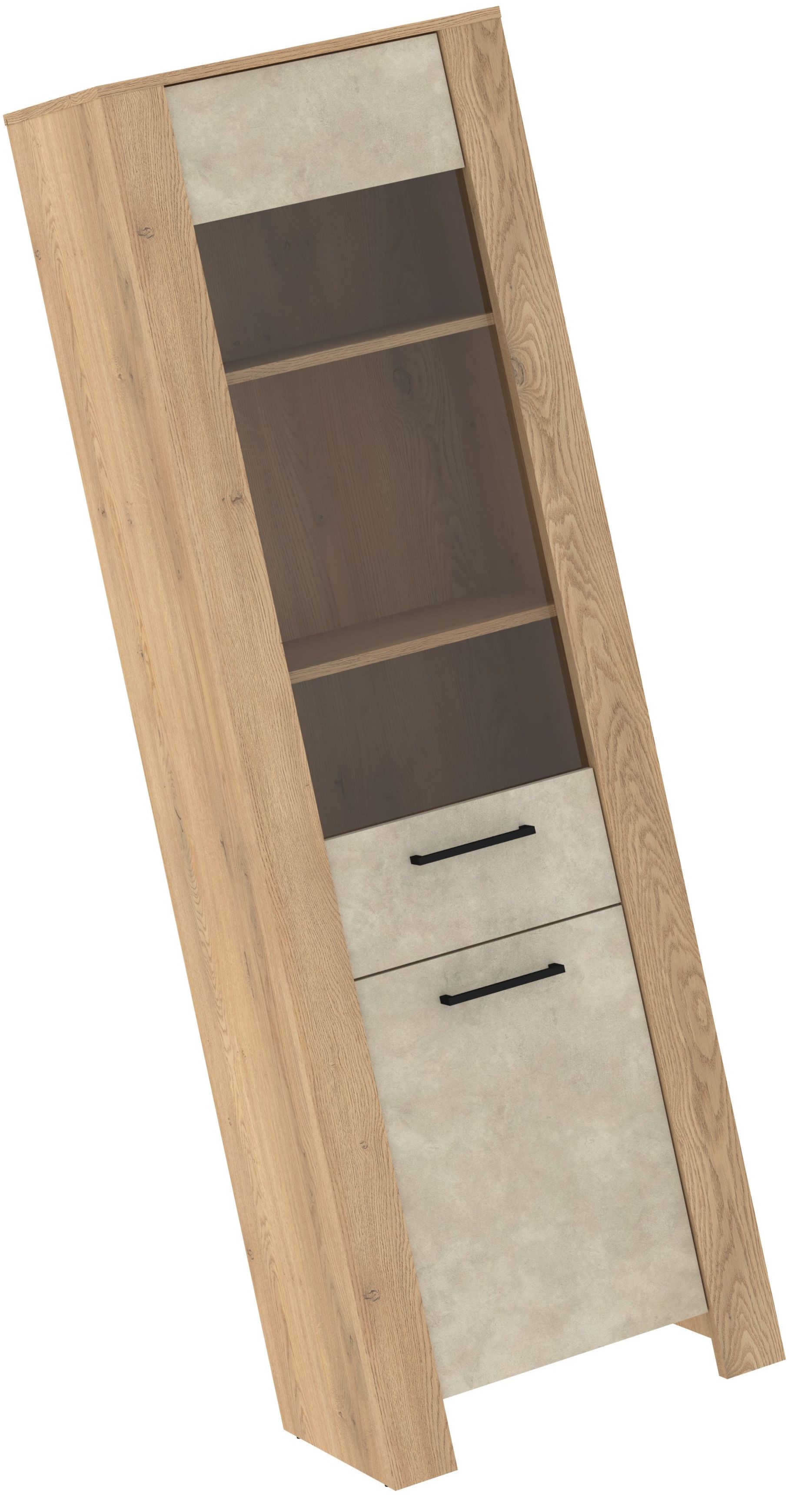 DELIS 15 baldai, aukšta, siaura vitrina svetainei, kremonos ąžuolas, granada, migdolų spalvos