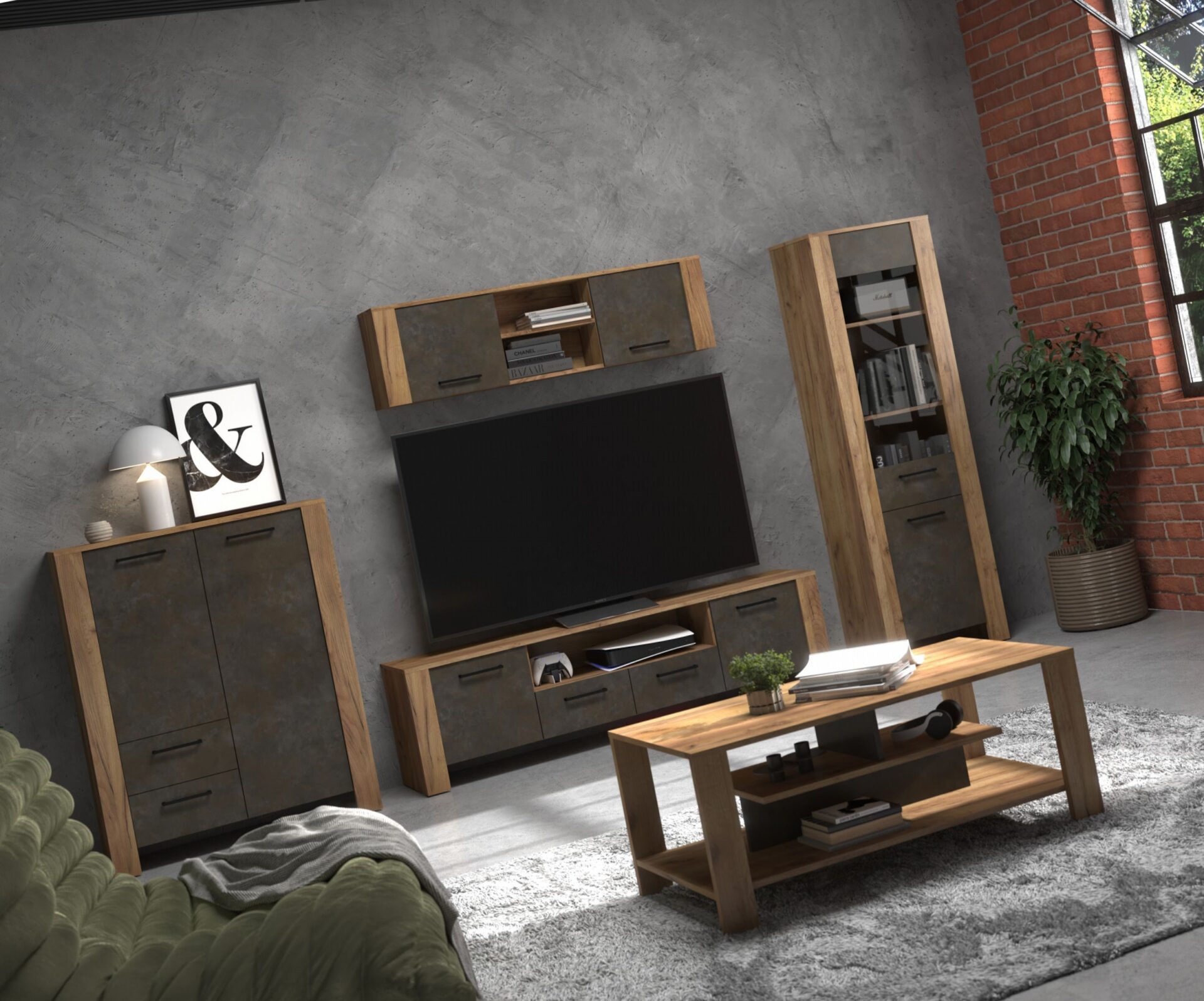 DELIS komplektas 2. 16 mm ir 25 mm plokštė, ABS kraštas, švelnaus uždarymo, PILNAI ATIDARYTOS bėgelės. Komplektą sudaro: DELIS 08 baldai, lentyna 97/118/43 – 53 kg – 2 vnt., DELIS 11 baldai, televizoriaus spintelė 175/49/43 – 42 kg – 1 vnt., DELIS 15 baldai, vitrina 58/186/43 – 46,5 kg – 3 vnt., DELIS 13 baldai, lentyna 140/39/27 – 19 kg – 1 vnt., DELIS 06 baldai, kavos staliukas 110/46/60 – 22 kg – 1 vnt. Spalva: auksinė rankdarbių ąžuolo / granados ruda.