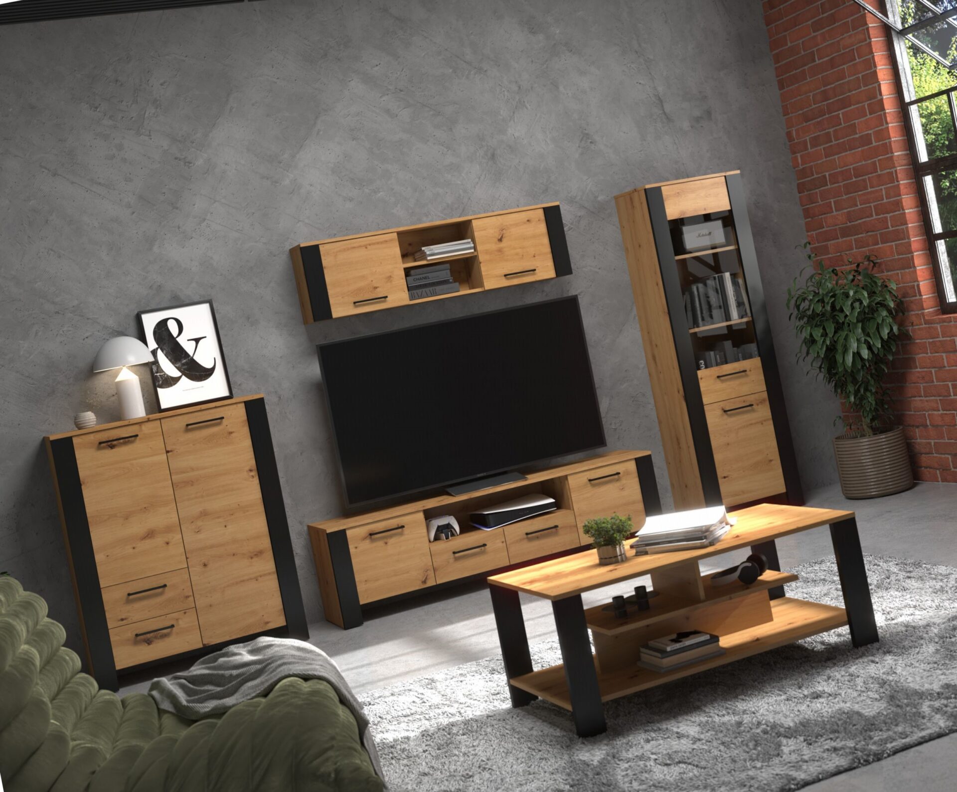DELIS komplektas 2. 16 mm ir 25 mm plokštė, ABS kraštas, švelnaus uždarymo, PILNAI ATIDARYTOS bėgelės. Komplektą sudaro: DELIS 08 baldai, lentyna 97/118/43 – 53 kg – 2 vnt., DELIS 11 baldai, televizoriaus spintelė 175/49/43 – 42 kg – 1 vnt., DELIS 15 baldai, vitrina 58/186/43 – 46,5 kg – 3 vnt., DELIS 13 baldai, lentyna 140/39/27 – 19 kg – 1 vnt., DELIS 06 baldai, kavos staliukas 110/46/60 – 22 kg – 1 vnt. Spalva: dirbtinio ąžuolo / juoda.