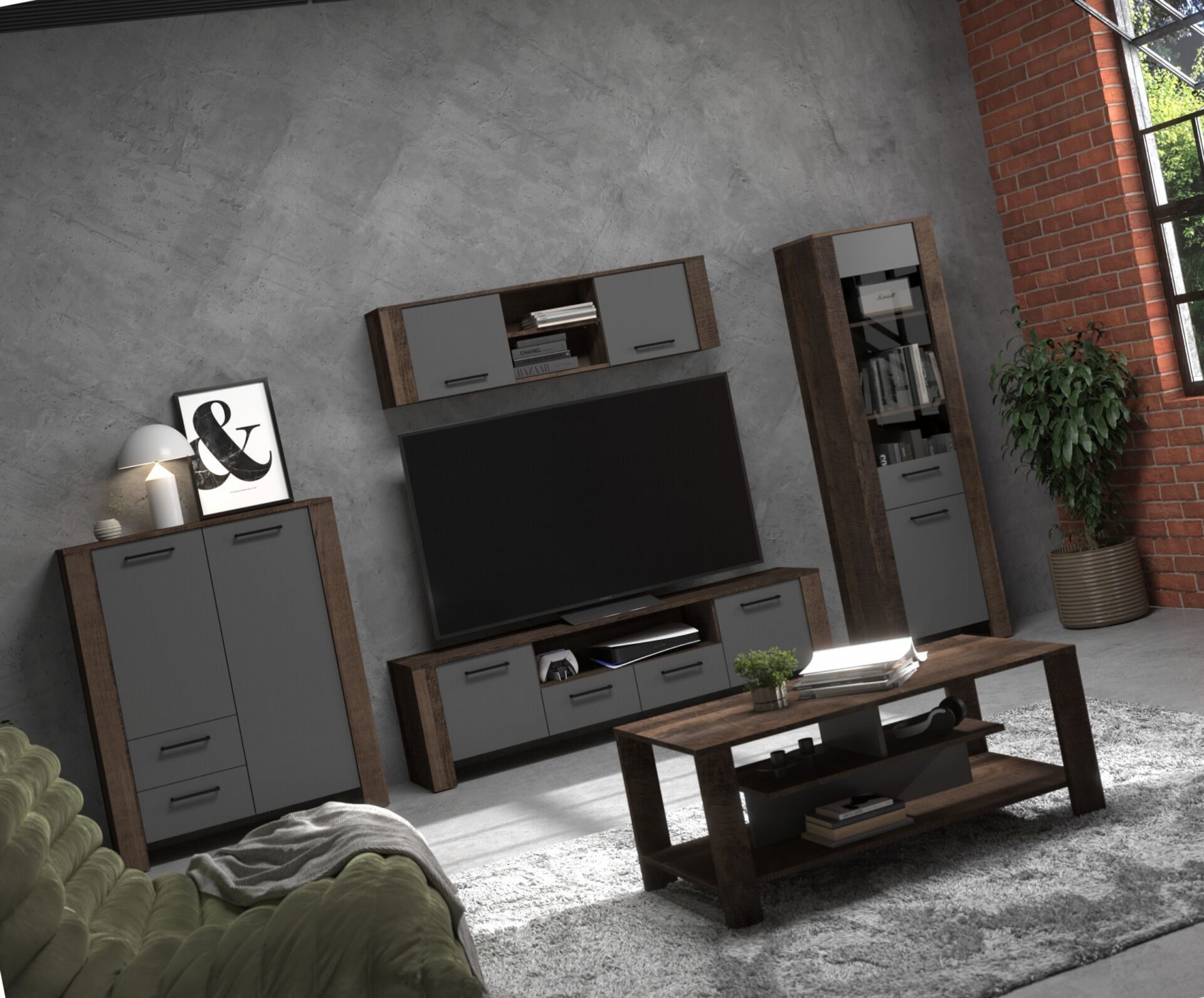 DELIS baldai #2 lentyna TV spintelė lentyna kavos staliukas Grange grafito spalvos ąžuolas