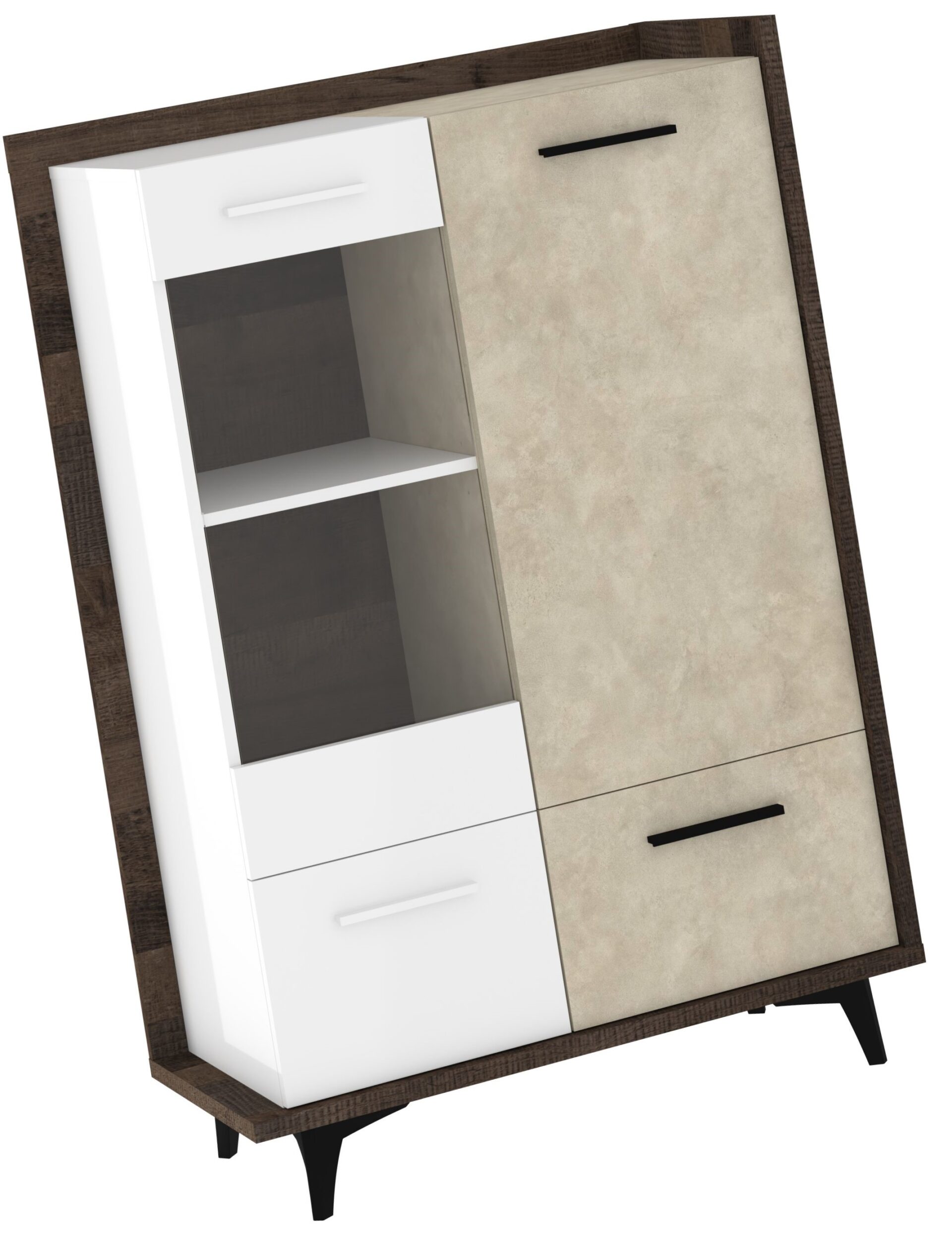 DOX 13 baldai, žema vitrina svetainei su durelėmis, ąžuolo ir granados spalvos, balta granada