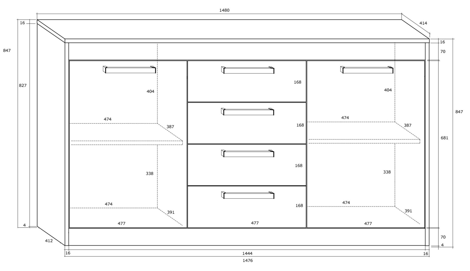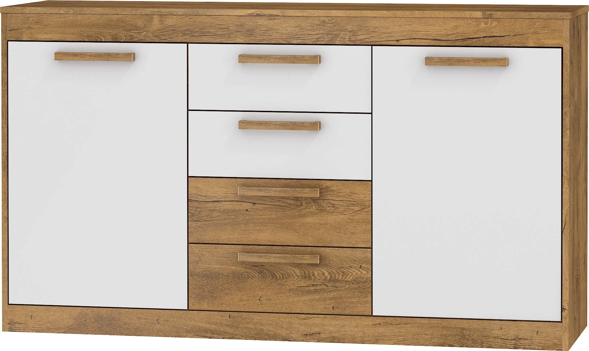 Baldai pagaminti iš 16 mm ir 25 mm storio medžio drožlių plokštės su ABS briaunomis. Stalčiai ir durys turi švelnaus uždarymo sistemą. Galimos spalvos: Artisan Oak / blizgi balta, Light Sonoma Oak / blizgi balta, Burgundijos ąžuolas / blizgi balta, Gold Craft Oak / balta Craft Oak.
