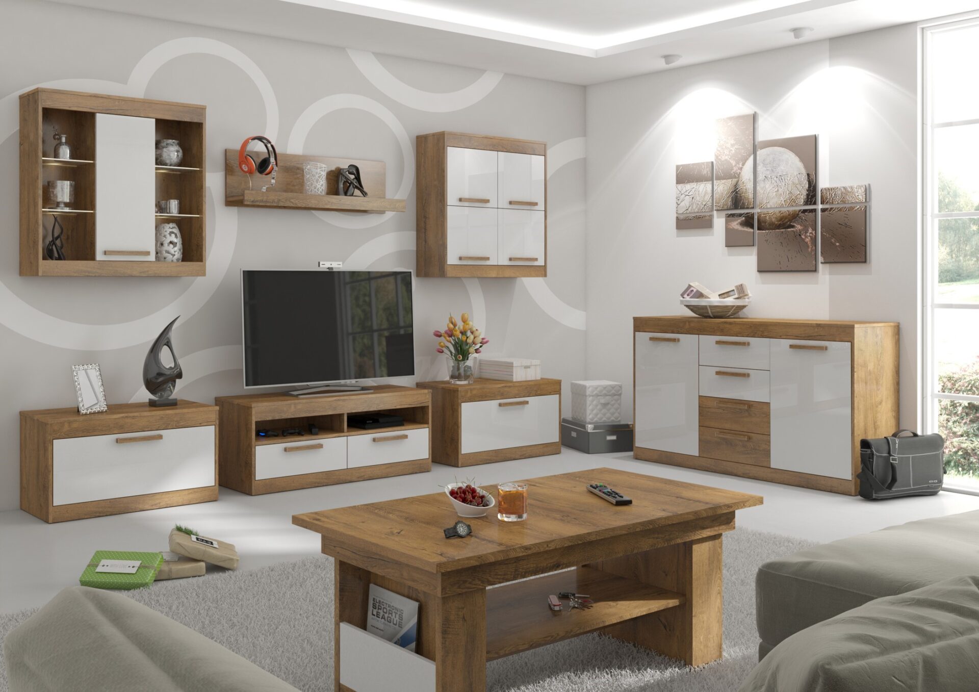 Komplektą sudaro: EMAX 41 4 durų sieninė spintelė [80/84/31], EMAX 22 maža lentynėlė [100/30/22], 2x EMAX 33 1 durų televizoriaus staliukai [80/46/44], EMAX 34 2 durų televizoriaus staliukas [110/46/44], EMAX 40 1 durų sieninė spintelė [80/84/31], EMAX 16 kavos staliukas [125/53/68], EMAX 08 2 durų 4 durų komoda [148/85/44]