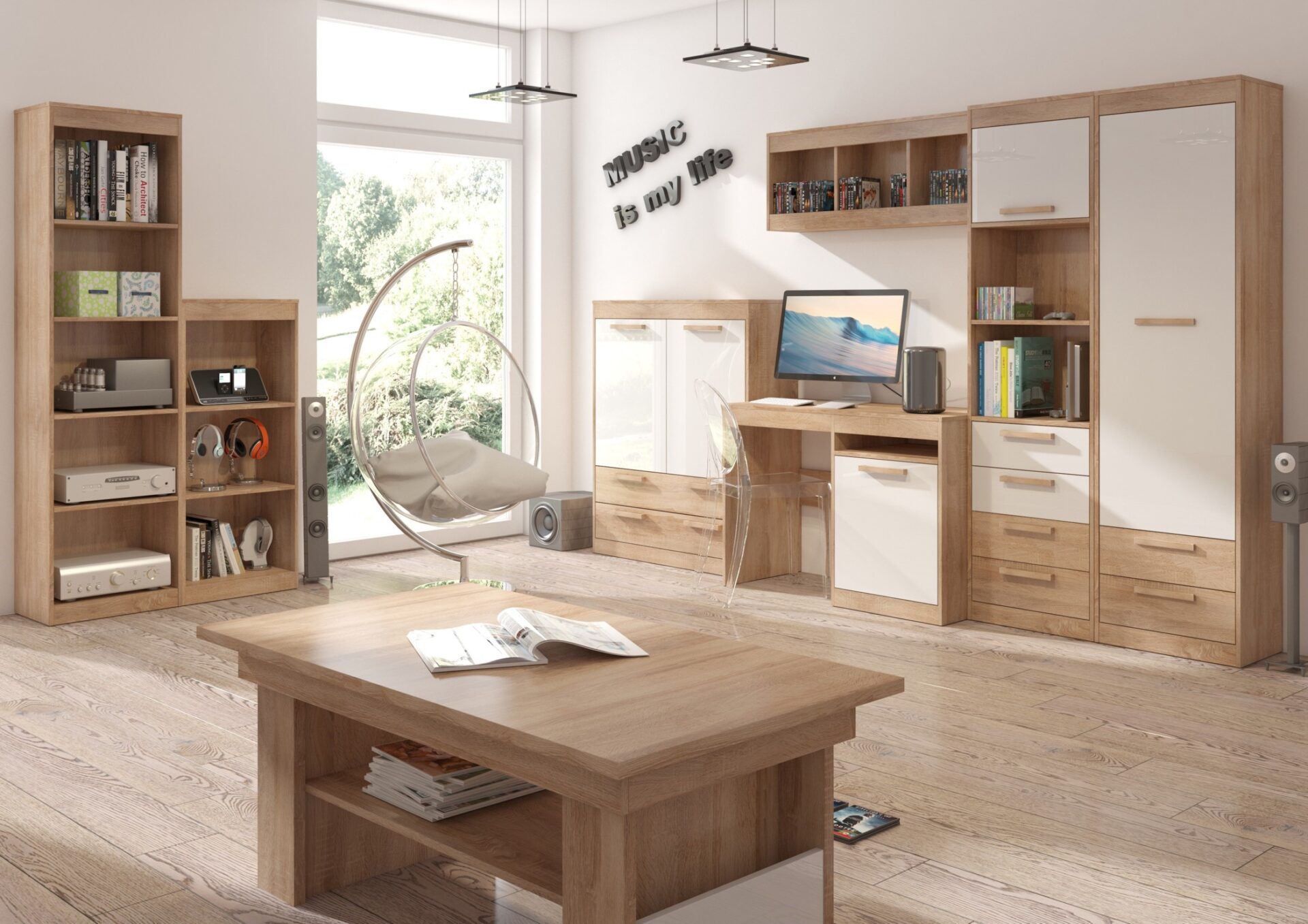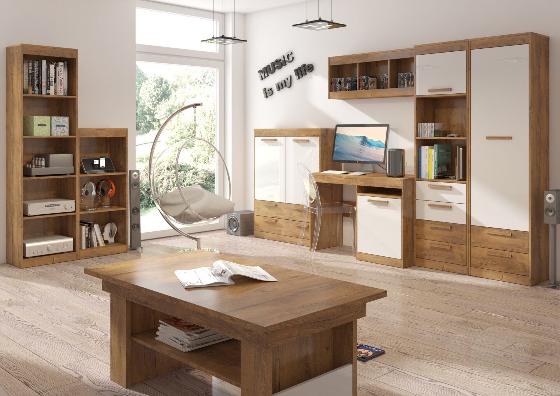 Komplektą sudaro: EMAX 28 W lentyna [52/193/34], EMAX 24 N lentyna [52/121/34], EMAX 26 N2D2S lentyna [100/121/36], EMAX 02 1D rašomasis stalas [110/77/53], EMAX 20 lentyna [110/42/22], EMAX 29 W1D4S lentyna [52/193/36], EMAX 01 1D2S šifonė [52/193/36], EMAX 16 kavos staliukas [125/53/68]