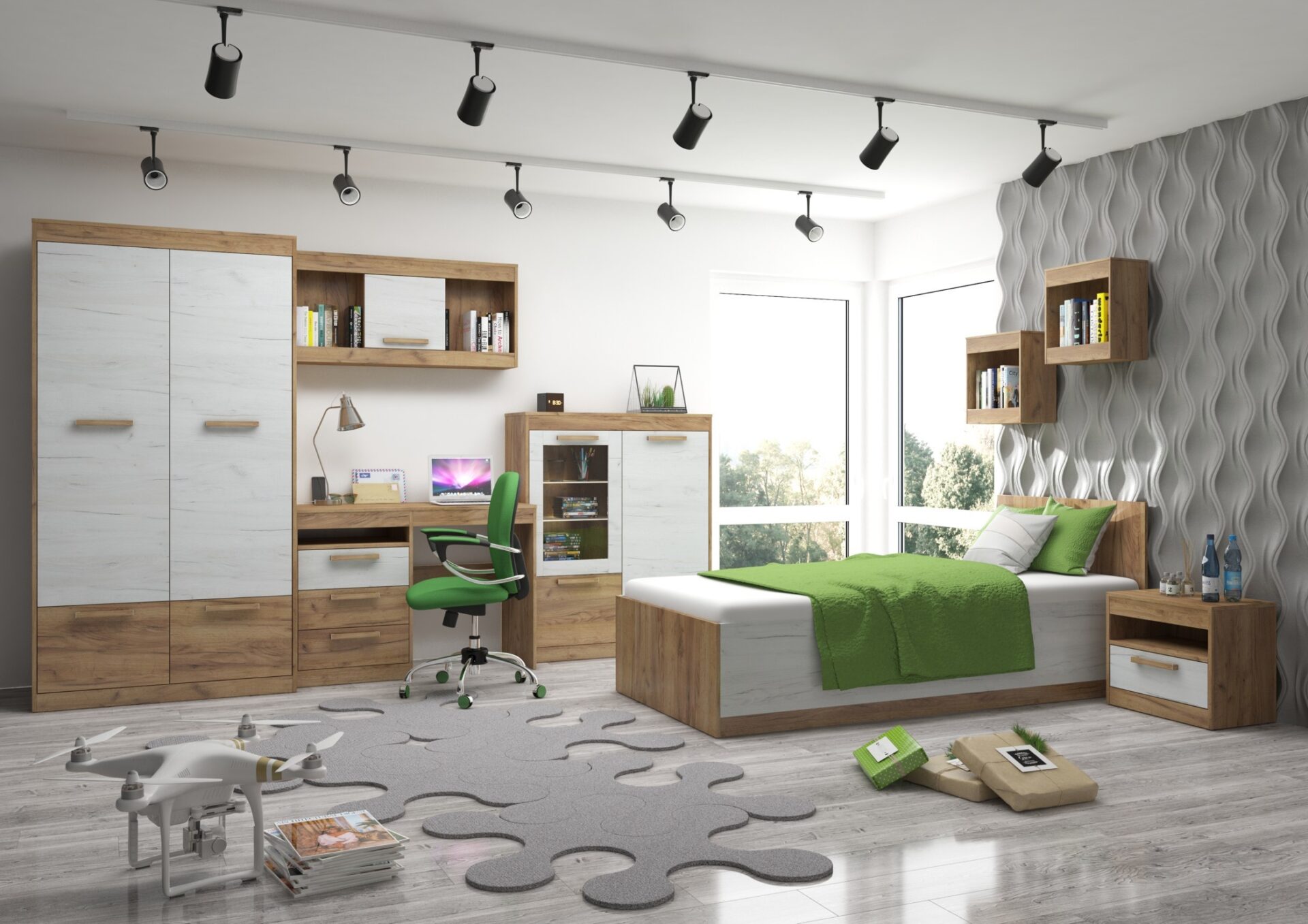 Komplektą sudaro: EMAX 37 4 durų spinta [100/193/60] EMAX 03 3 durų rašomasis stalas [110/77/53] EMAX 21 1 durų lentyna [110/50/24] EMAX 27 N2DW knygų lentyna [100/121/36] EMAX 23 lentynos (2 vnt.) [40/42/22] EMAX 19 90 cm lova be čiužinio [204/81/94] EMAX 32 naktinis staliukas [52/46/36]
