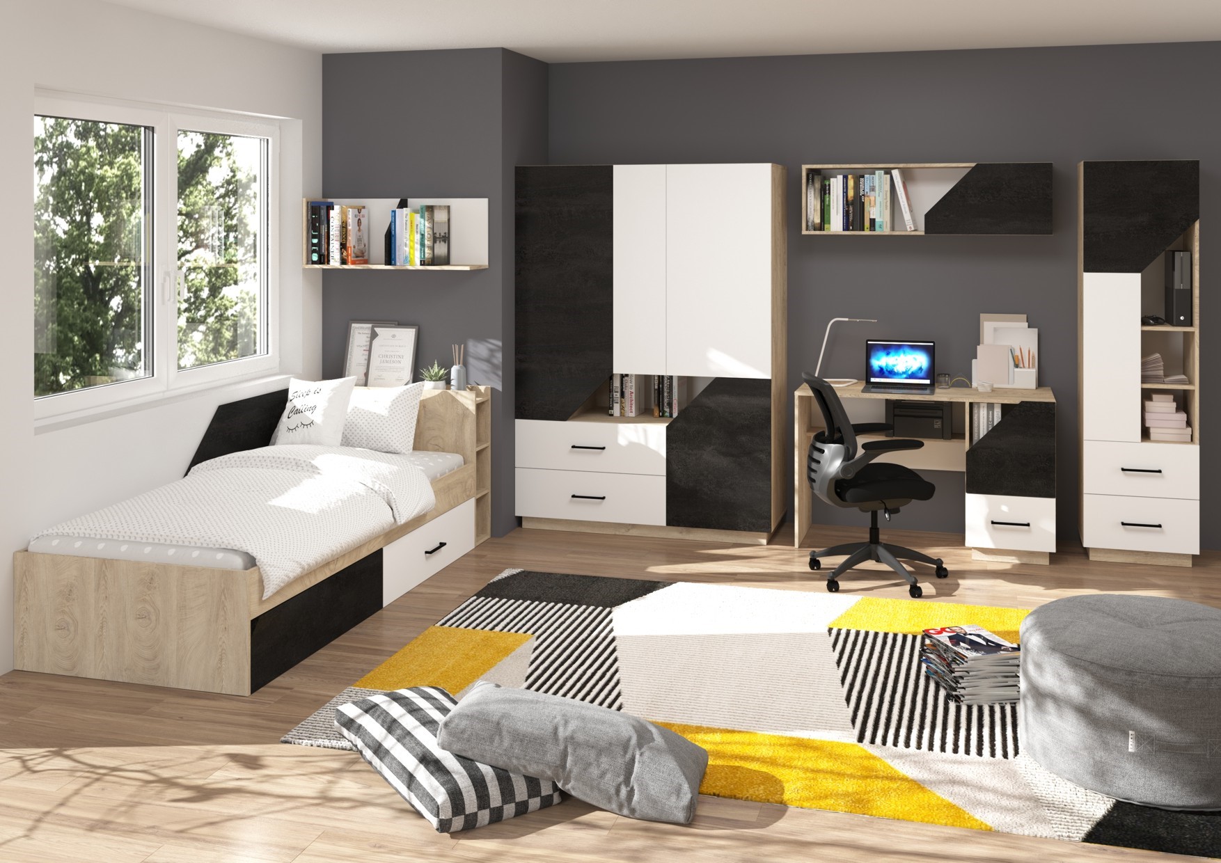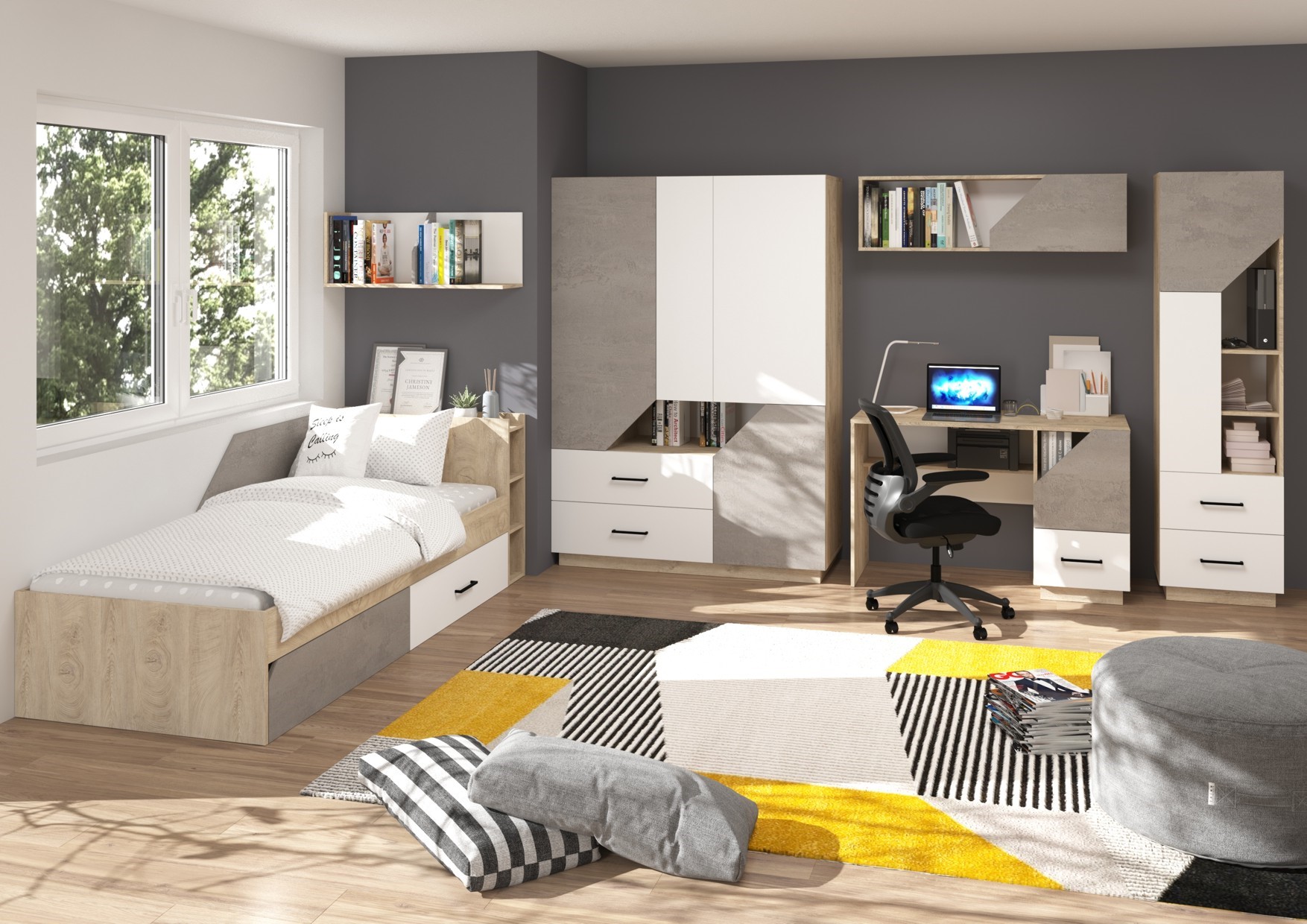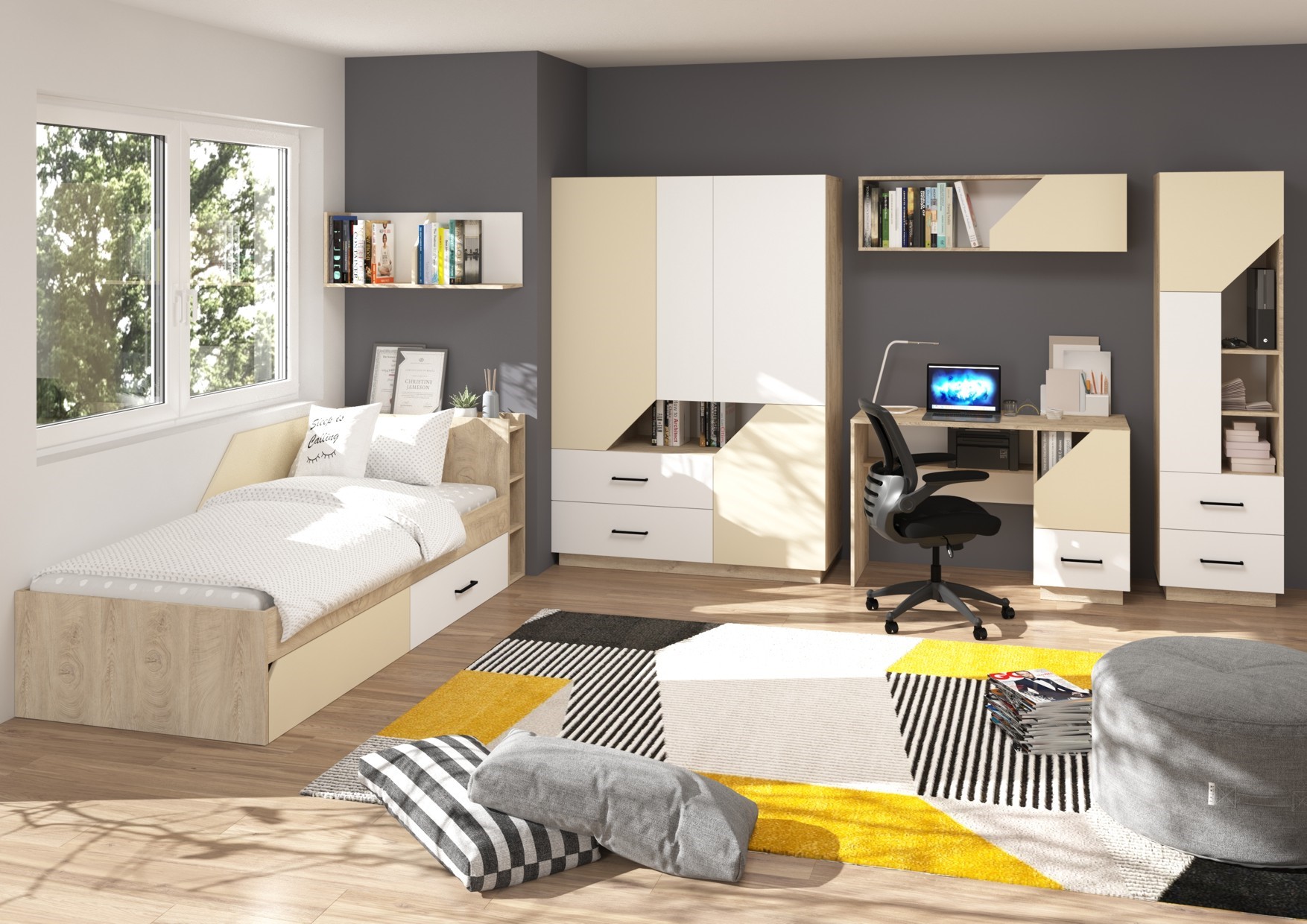 Komplektą sudaro: EPA 01 žaidimų kompiuterio stalas [120/76/57] EPA 08 vaikiška lova be čiužinio [224/76/97] EPA 09 pakabinama lentyna [90/35/25] EPA 16 žaislų knygų lentyna [50/187/43] EPA 23 drabužių spinta [133/187/57] EPA 24 pakabinama spintelė [120/35/27]