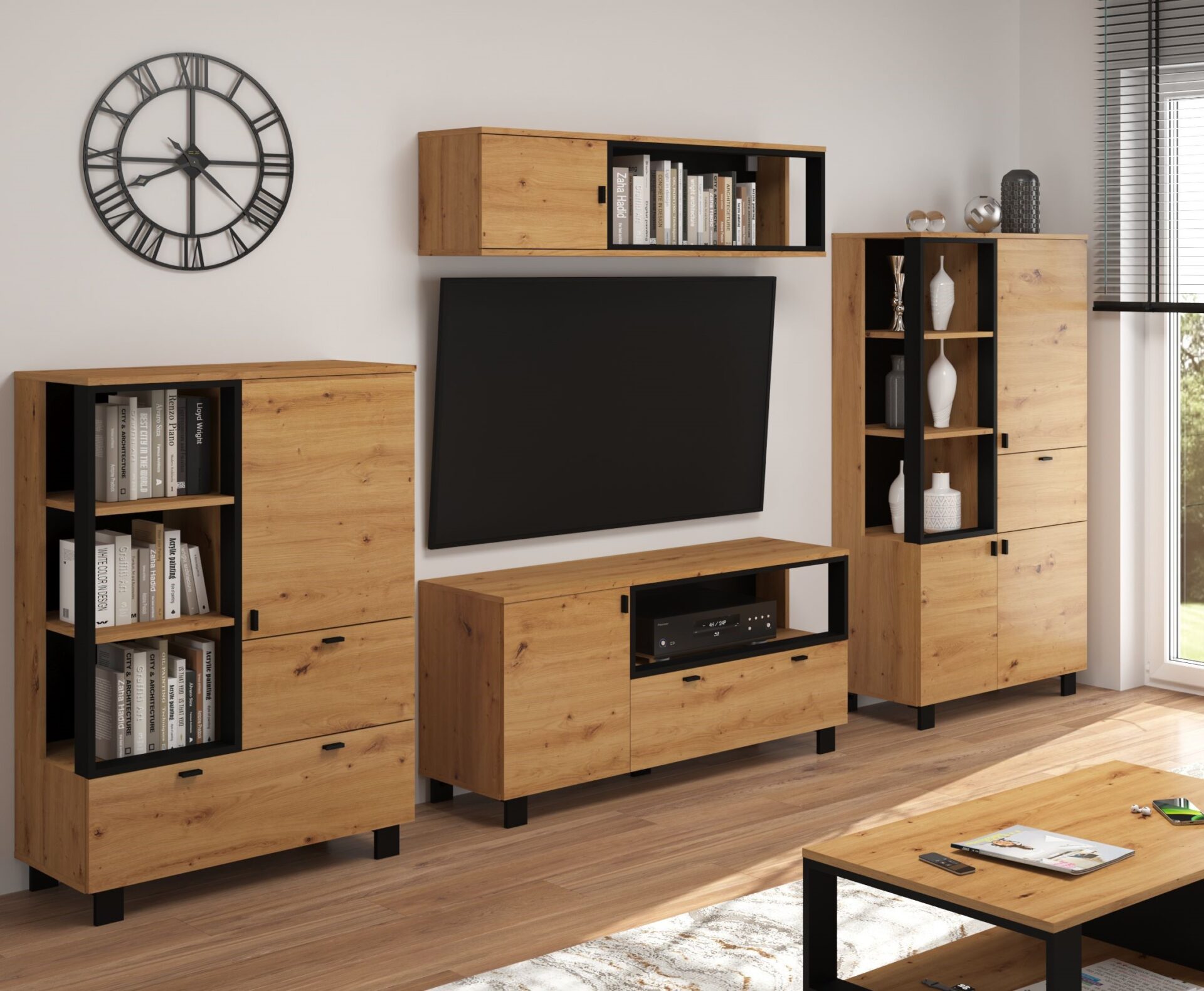 Komplektą sudaro: GAVES 06 lentyna 80/119/42 – 46 kg – 2 vnt.; GAVES 09 lentyna 80/154/42 – 52 kg – 2 vnt.; GAVES 12 televizoriaus staliukas 120/60/42 – 33 kg – 1 vnt.; GAVES 15 pakabinama lentyna 120/33/32 – 15 kg – 1 vnt. Spalva: „Artisan Oak“ / juoda.