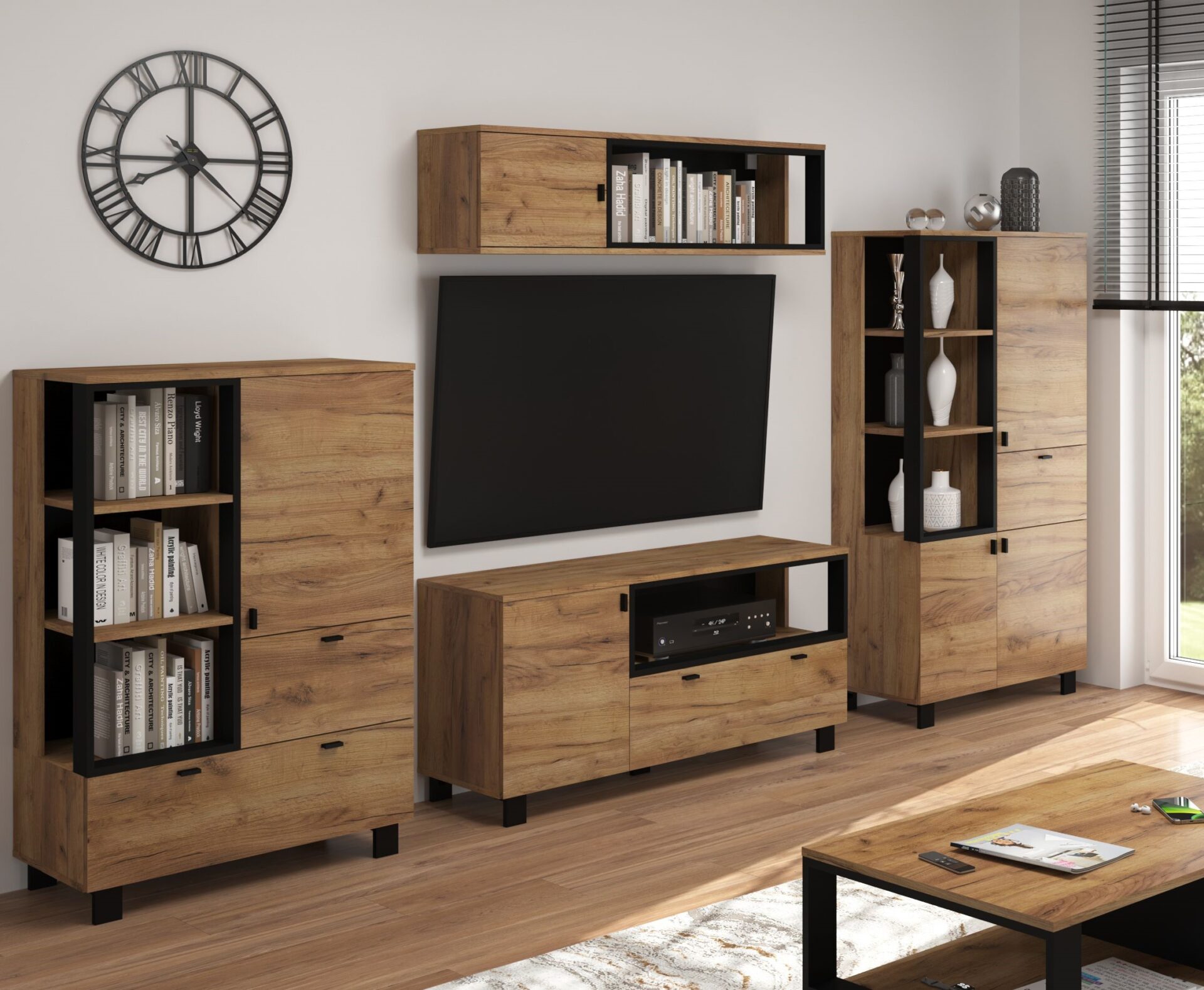 Komplektą sudaro: GAVES 06 Lentyna 80/119/42 – 46 kg – 2 vnt. GAVES 09 Lentyna 80/154/42 – 52 kg – 2 vnt. GAVES 12 TV staliukas 120/60/42 – 33 kg – 1 vnt. GAVES 15 Pakabinama lentyna 120/33/32 – 15 kg – 1 vnt. Spalva: Auksinė, ąžuolo imitacija / Juoda