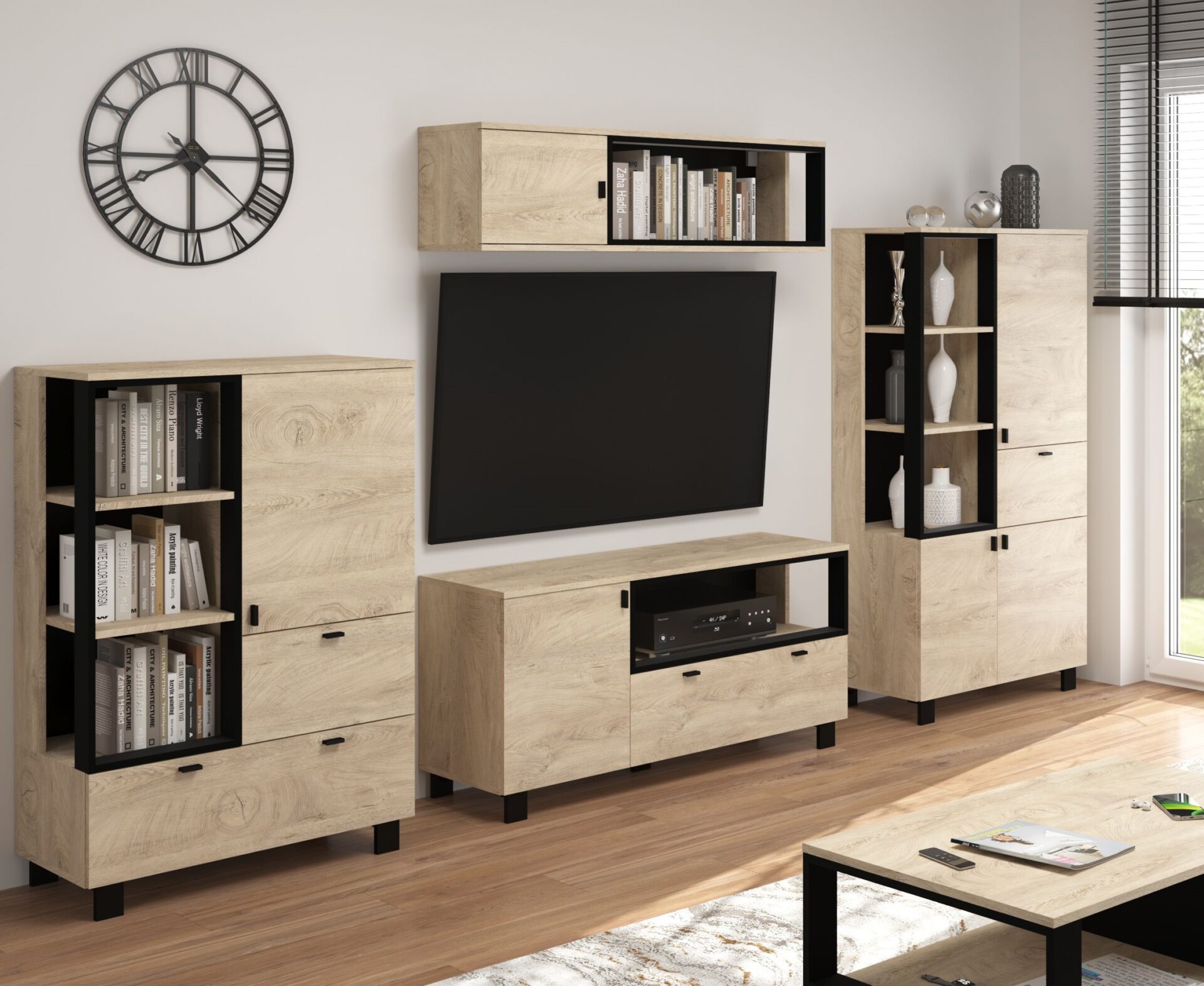 Komplektą sudaro: GAVES 06 lentyna 80/119/42 – 46 kg – 2 vnt. GAVES 09 lentyna 80/154/42 – 52 kg – 2 vnt. GAVES 12 televizoriaus staliukas 120/60/42 – 33 kg – 1 vnt. GAVES 15 pakabinama lentyna 120/33/32 – 15 kg – 1 vnt. Spalva: ąžuolo kraštai / juoda