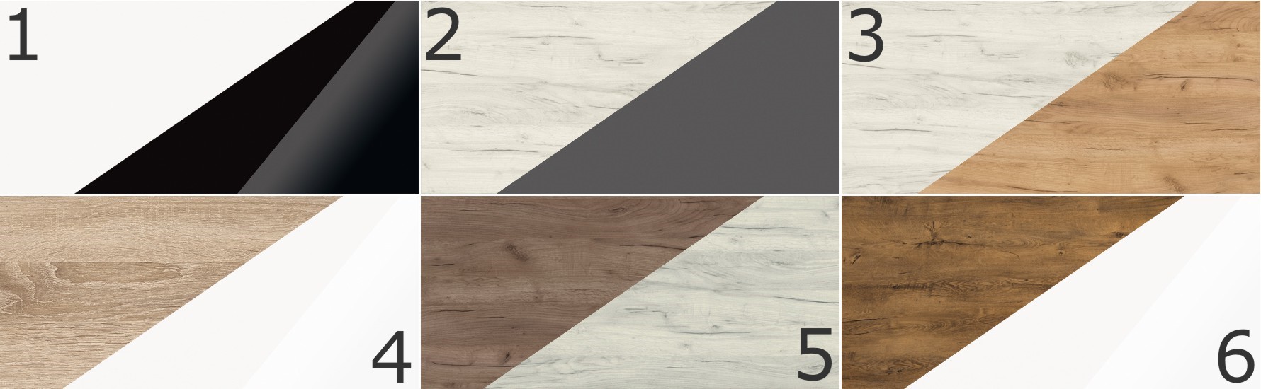 Baldai pagaminti iš 16 mm ir 25 mm storio medžio drožlių plokštės su ABS kraštais. Stalčiai ir durelės turi švelnaus uždarymo sistemą. Spalvų variantai: balta / blizgi juoda, baltas ąžuolas / grafito spalvos, baltas ąžuolas / auksinis ąžuolas, šviesus Sonoma ąžuolas / blizgi balta, tabako spalvos ąžuolas / baltas ąžuolas, bordo spalvos ąžuolas / blizgi balta.