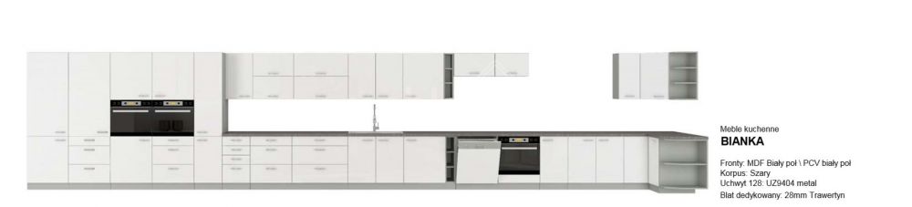 Rekomenduojame modernų, 180 cm pločio, blizgantį virtuvės komplektą „Bianka“.