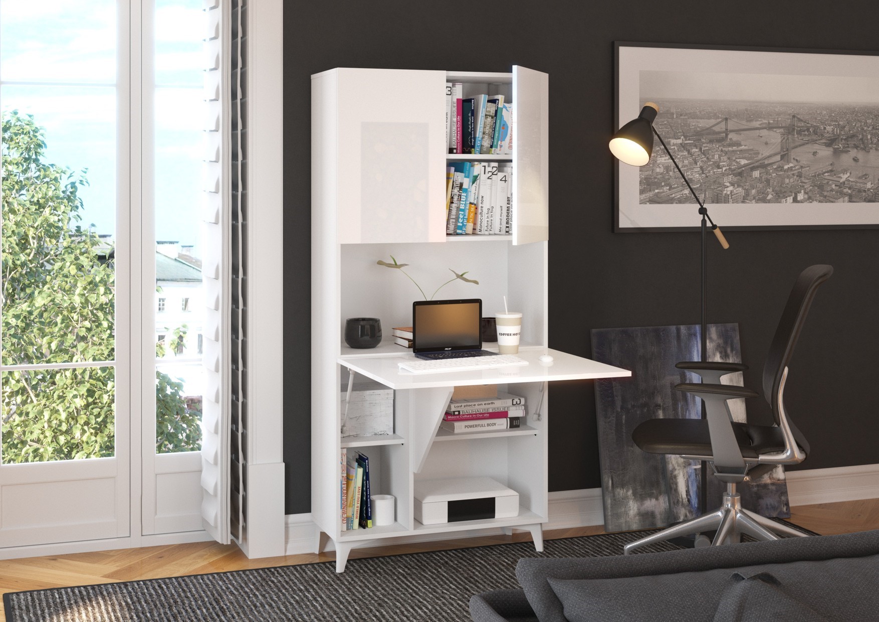 Būkite pirmas aprašęs “MEGI baldai 1 lentyna + stalas balta / balta blizgi”