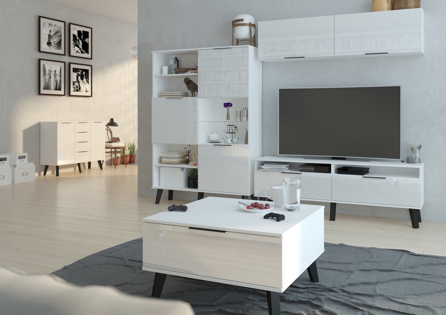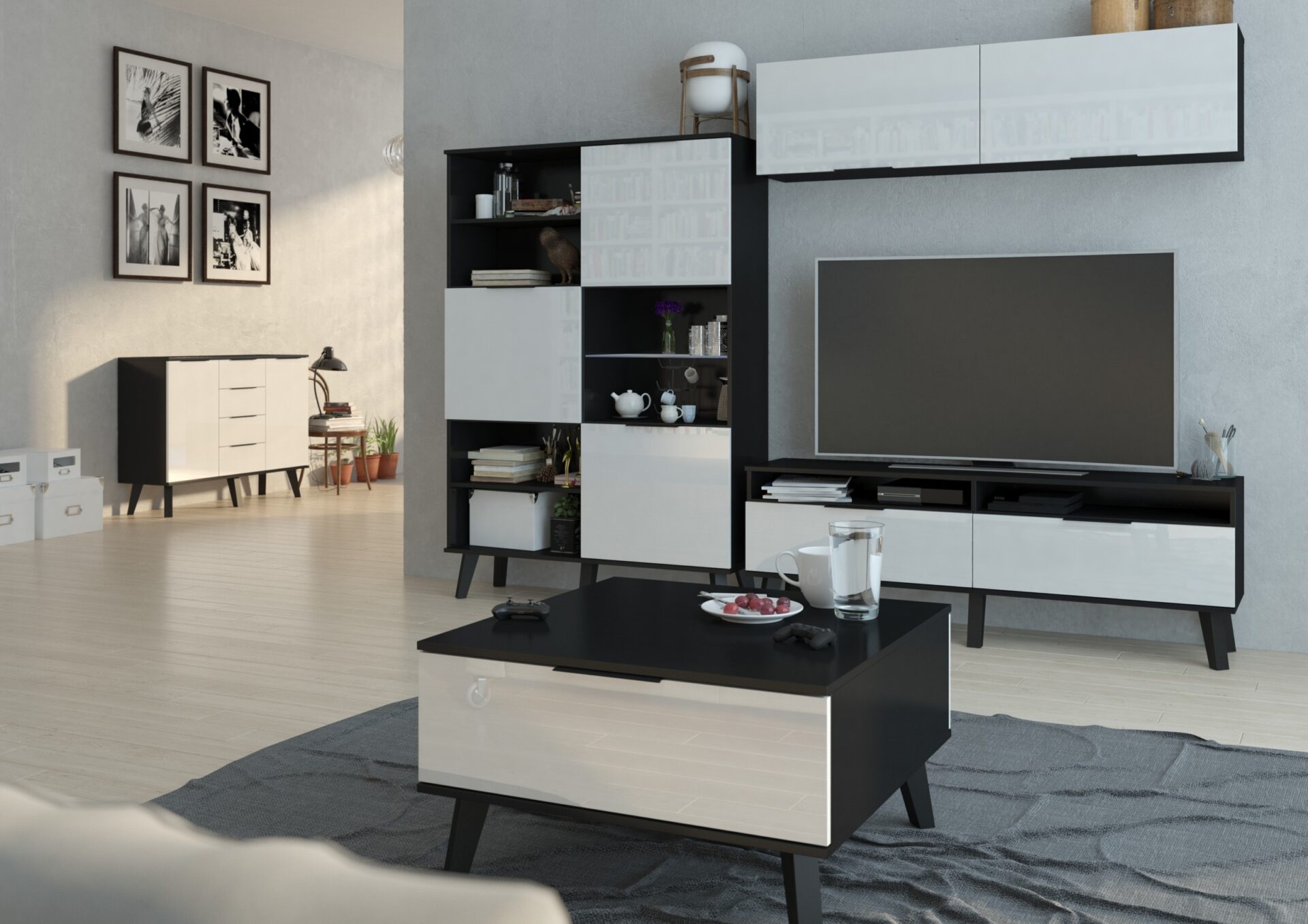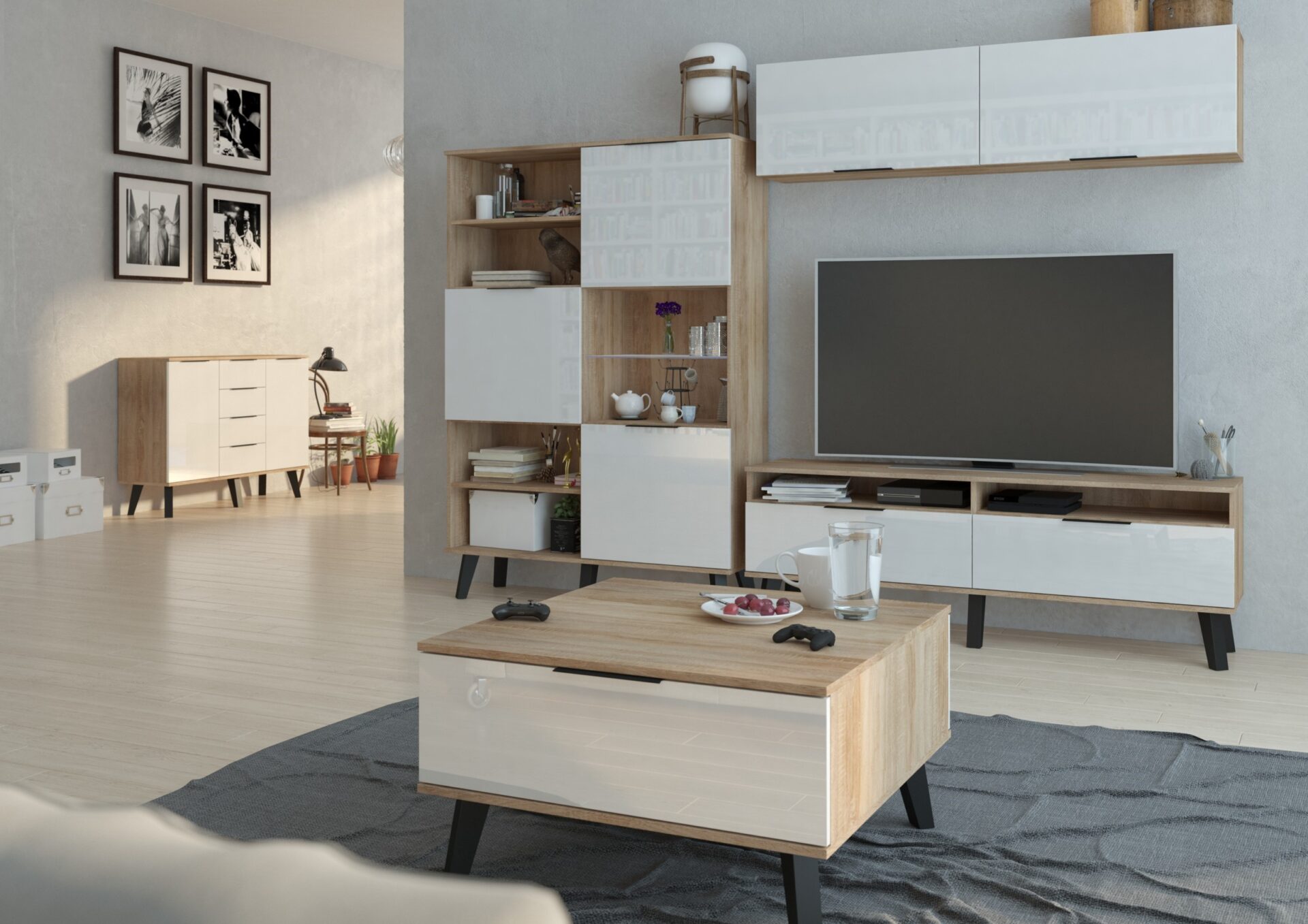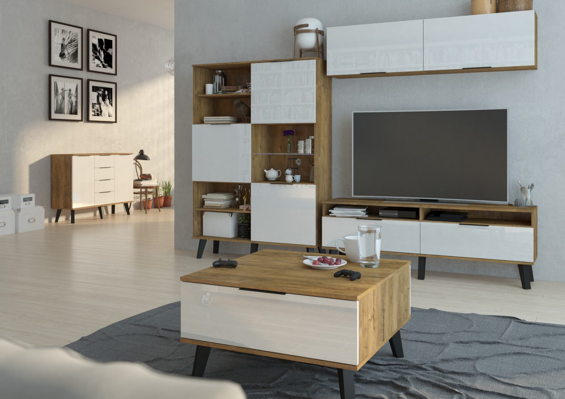 Komplektą sudaro: komoda VENS 02 2-D 4S [120/89/40], VENS 09 3-D lentyna [120/174/40], VENS 11 2-D televizoriaus staliukas [160/57/40], 2x VENS 16 1DPZ sieninės spintelės [80/40/30], VENS 06 mažas kavos staliukas [80/46/84] [cm]