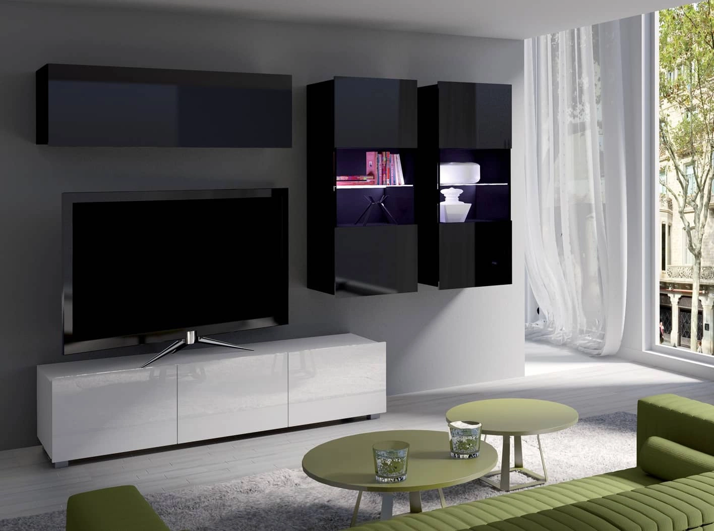 Įstiklintos vitrinų priekinės dalys leis jums pademonstruoti svetainės aksesuarus. Erdviose televizoriaus spintelėse tilps visi jūsų aksesuarai ir buitinė technika. Subtiliai virš stalviršio išsikišusios priekinės dalys taip pat atlieka rankenos funkciją. Papildomas televizoriaus staliuko privalumas – galimybė pasirinkti jo padėtį. Televizoriaus staliuko gali stovėti ant grindų. Dėl pridedamų pakabų televizoriaus staliuko staliuką galima greitai paversti sieniniu įrenginiu.