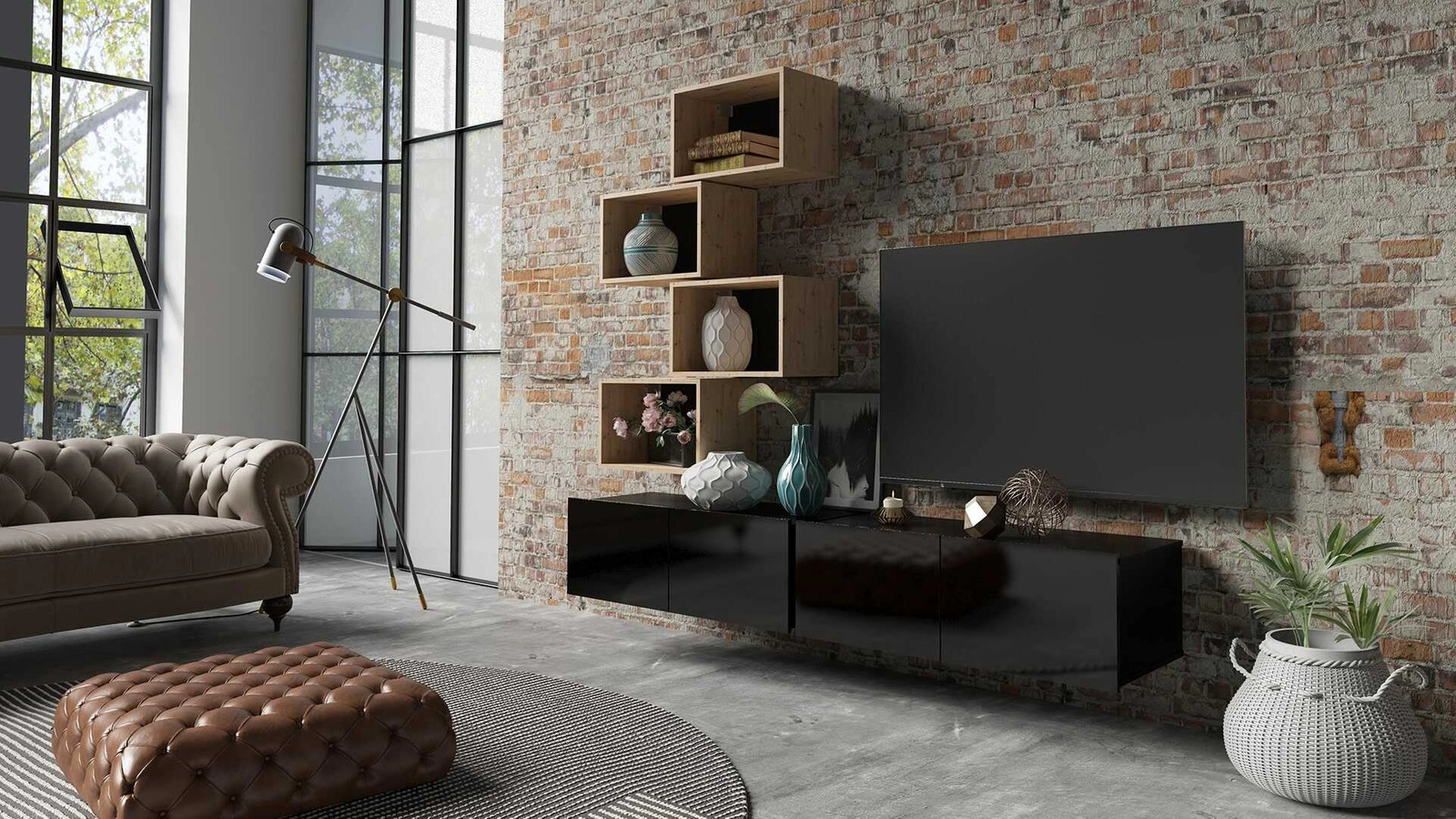 „Apulia XXX“ sieninė spintelė, juodai blizgi / dirbtinio ąžuolo, išskirtinai stilinga sieninė spintelė, paprastų formų, tinkančių bet kokiam interjerui