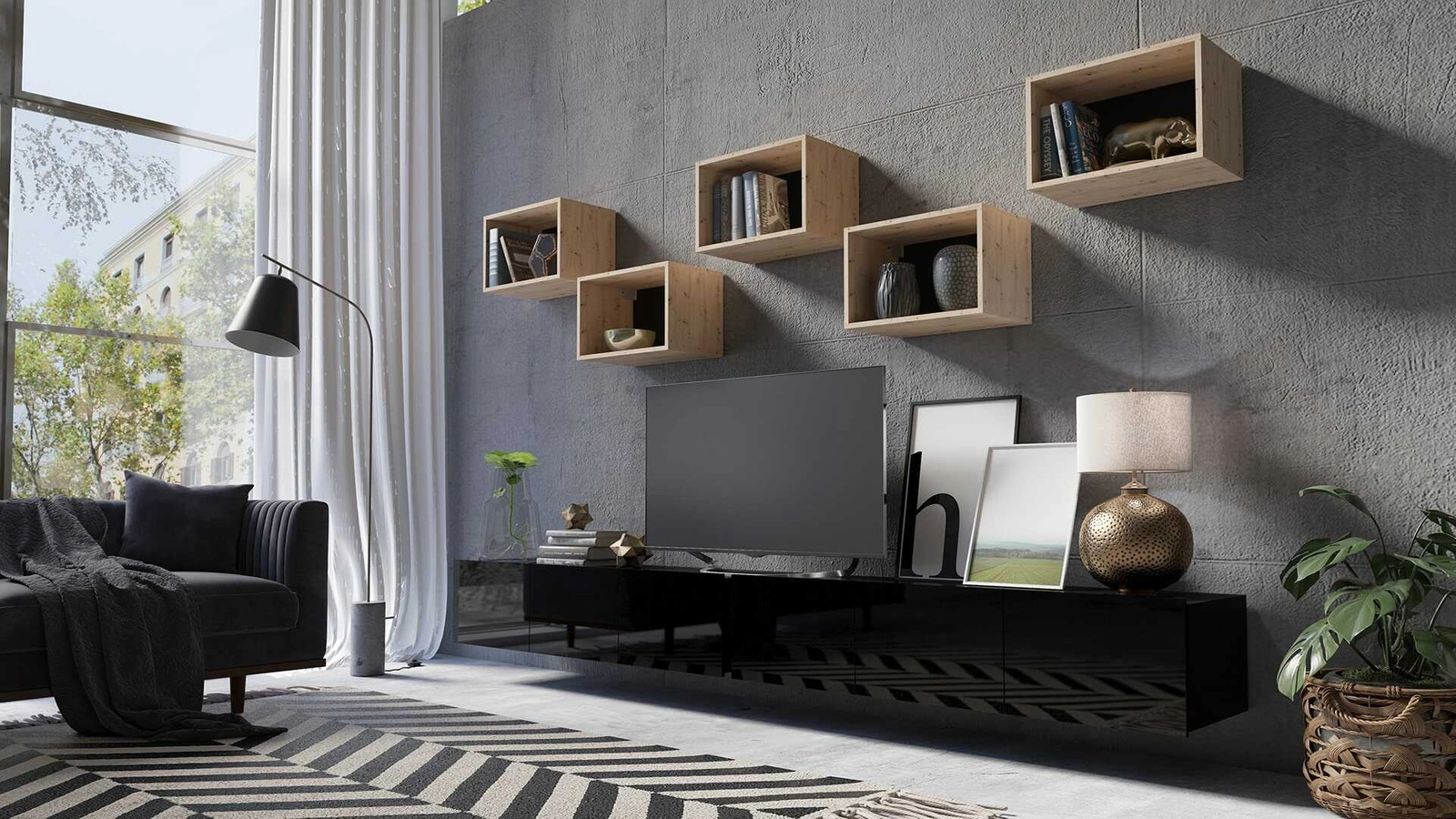 Atviros lentynos leidžia subtiliai eksponuoti svetainės aksesuarus. Erdviose televizoriaus spintelėse tilps visi aksesuarai ir buitinė technika. Subtiliai virš stalviršio išsikišusios priekinės dalys taip pat atlieka rankenų funkciją. Papildomas televizoriaus staliukų privalumas – galimybė pasirinkti jų padėtį. Televizoriaus staliukas gali stovėti ant grindų. Dėl pridedamų pakabų televizoriaus staliuką galima greitai paversti sieniniu įrenginiu.