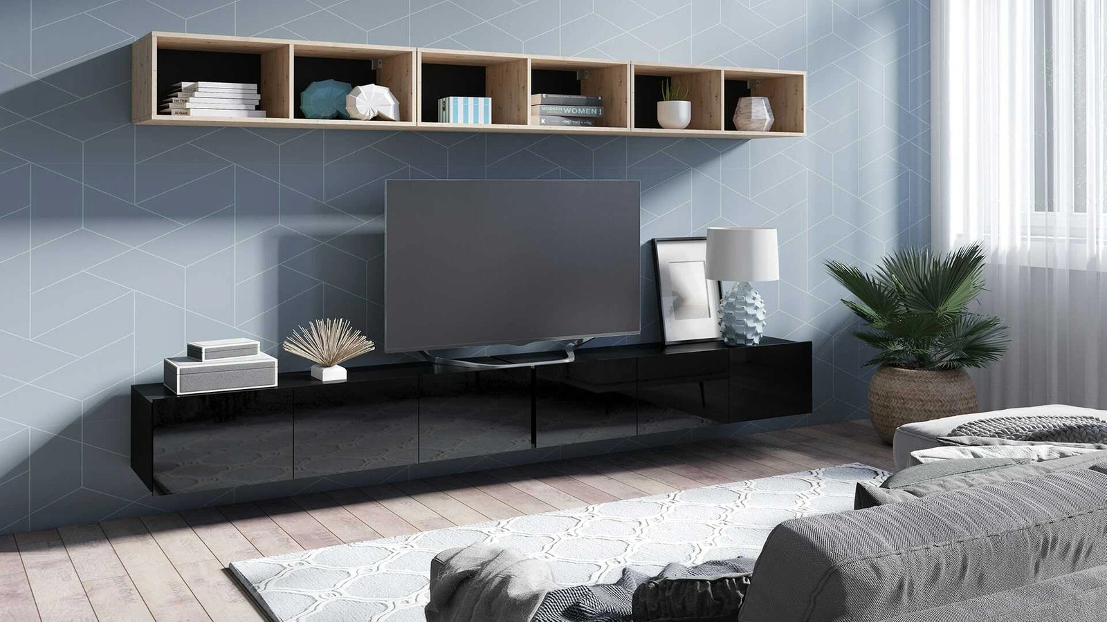 Atviros lentynos leidžia subtiliai eksponuoti svetainės aksesuarus. Erdviose televizoriaus spintelėse tilps visi aksesuarai ir buitinė technika. Subtiliai virš stalviršio išsikišusios priekinės dalys taip pat atlieka rankenų funkciją. Papildomas televizoriaus staliukų privalumas – galimybė pasirinkti jų padėtį. Televizoriaus staliukas gali stovėti ant grindų. Dėl pridedamų pakabų televizoriaus staliuką galima greitai paversti sieniniu įrenginiu.
