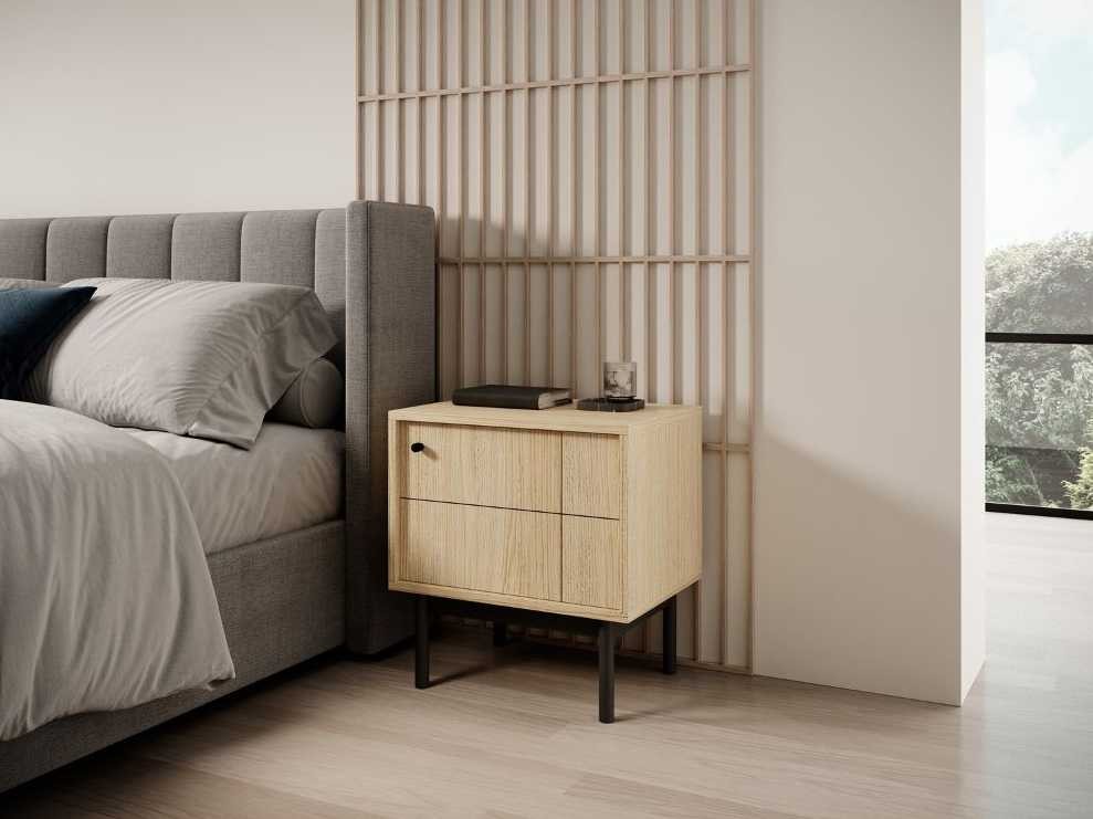 „Japandi“ kolekcija sukurta atsižvelgiant į dabartines tendencijas – ši komoda, apdailinta „Linea Oak“ ąžuolu, pasižymi frezuotais fasadais, kurie atidaromi juodomis metalinėmis rankenėlėmis.
