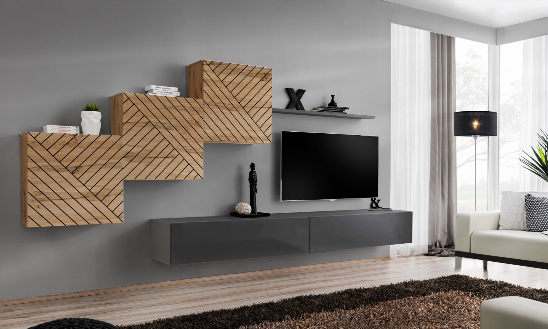 3 x kvadratinės sieninės spintelės su vienomis durelėmis – 1 lentyna viduje. Frezuotas priekis. 2 x sieninės televizoriaus spintelės su vienomis durelėmis – 2 skyriai viduje. 1 lentyna pridedama. Durys atsidaro spragtelėjus. Durys universaliam montavimui.
