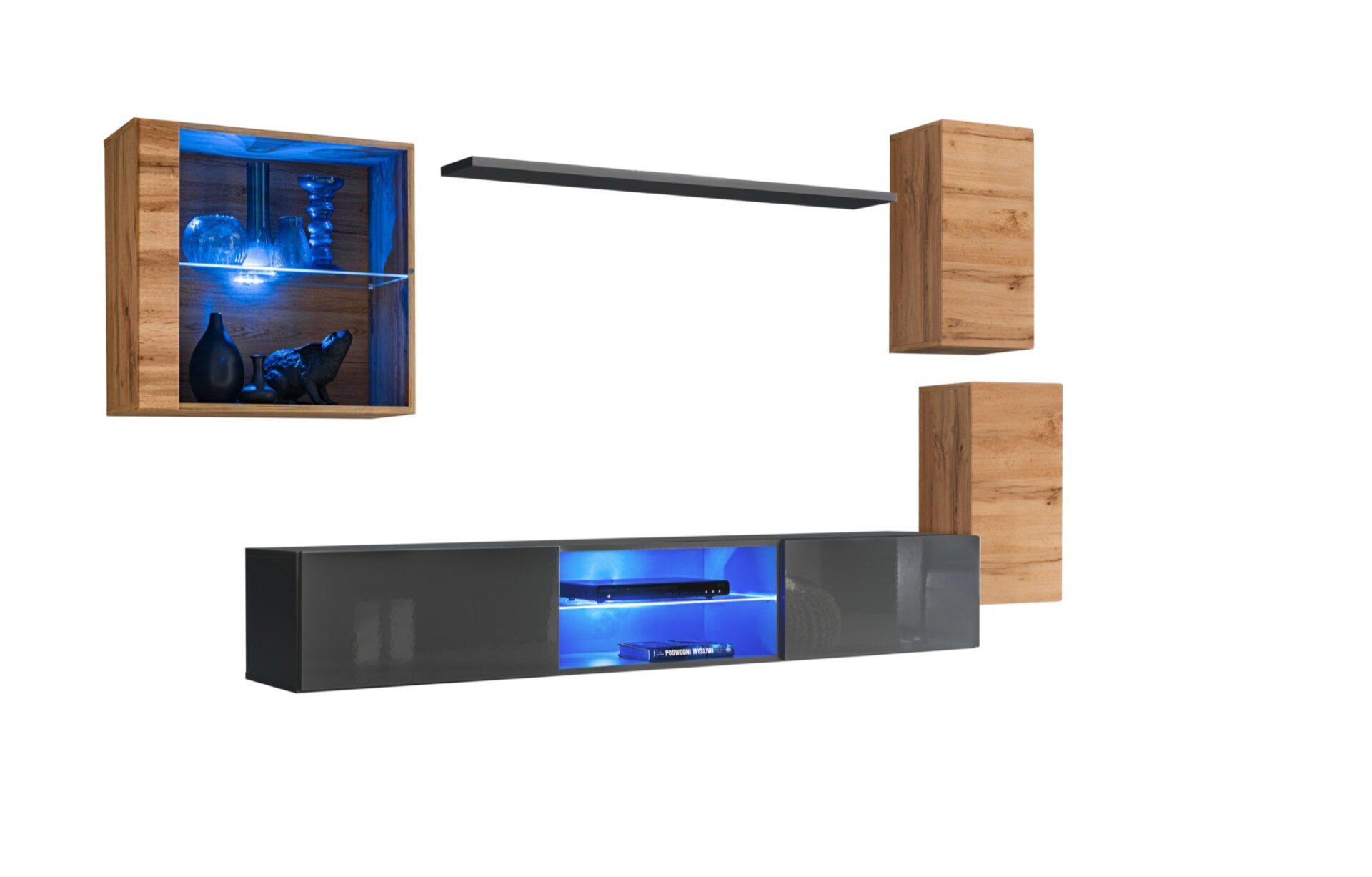Pakabinama vitrina: iš dalies įstiklintos durys, viena lentyna, apšviesta mėlynu LED apšvietimu. Pakabinama lentyna. 2x Pakabinama spintelė: durys, viena lentyna už jų (2 vietos). TV / radijo / televizoriaus spintelė: centrinis skyrius su stikline lentyna, apšviesta mėlynu LED apšvietimu, atvartai, paremti dujinėmis amortizatoriais šonuose, su vienu skyriumi už kiekvieno. Priekinės dalys atidaromos spustelėjimo mechanizmu.