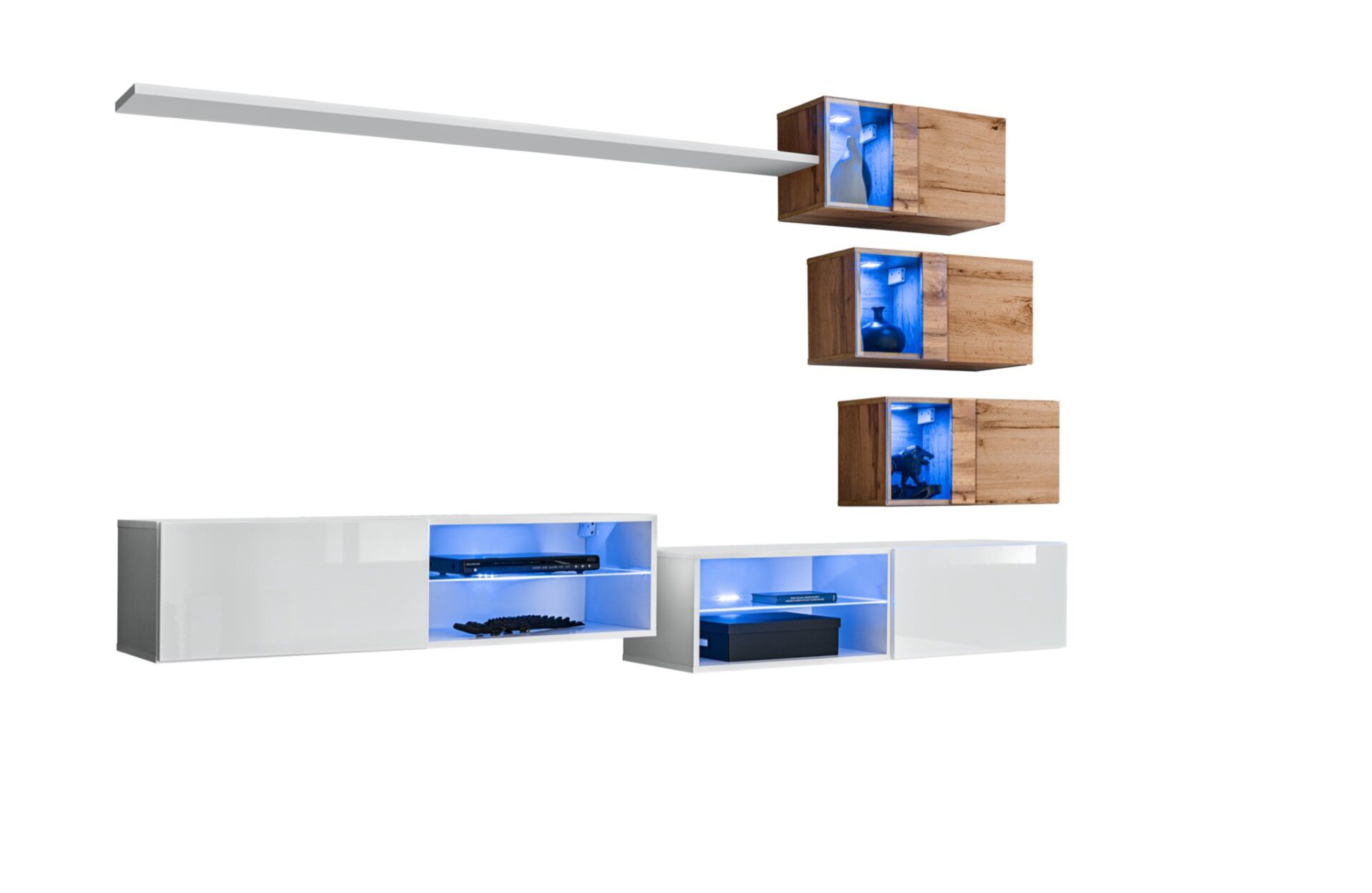 Prie sienos pakabinama lentyna. 3x Prie sienos pakabinamos spintelės: durelės su vienu skyriumi už jų. 3x Prie sienos pakabinamos vitrinos: iš dalies įstiklintos durelės su skyriumi už jų, apšviestu mėlynu LED apšvietimu. 2x Televizoriaus spintelės: skyrius su stikline lentyna, apšviesta mėlynu LED apšvietimu, šalia jo yra atvartas, kurį laiko dujinės atramos, ir atviras skyrius už jo. Priekinės dalys atidaromos spustelėjimo mechanizmu.