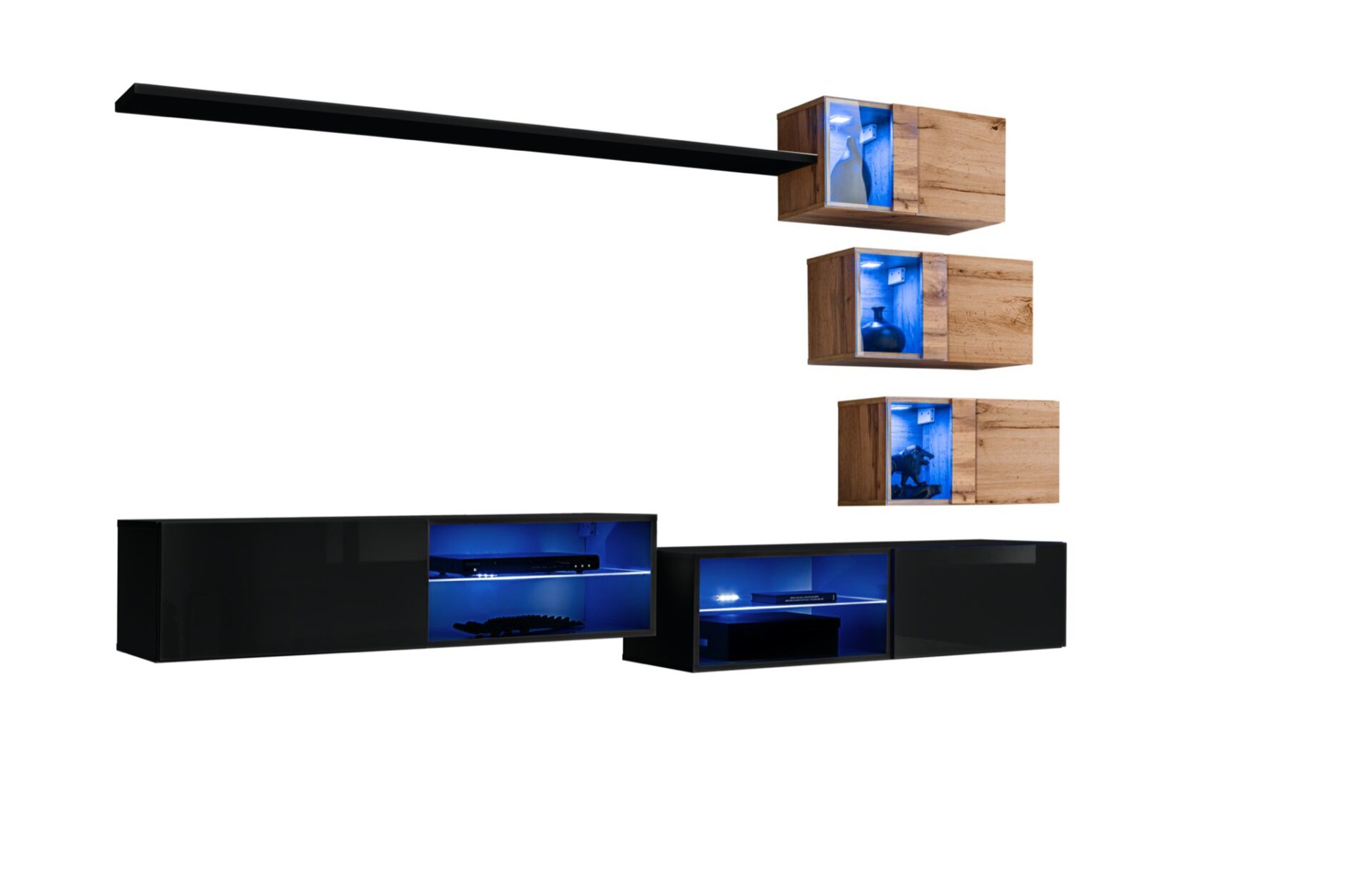 Prie sienos pakabinama lentyna. 3x Prie sienos pakabinamos spintelės: durelės su vienu skyriumi už jų. 3x Prie sienos pakabinamos vitrinos: iš dalies įstiklintos durelės su skyriumi už jų, apšviestu mėlynu LED apšvietimu. 2x Televizoriaus spintelės: skyrius su stikline lentyna, apšviesta mėlynu LED apšvietimu, šalia jo yra atvartas, kurį laiko dujinės atramos, ir atviras skyrius už jo. Priekinės dalys atidaromos spustelėjimo mechanizmu.