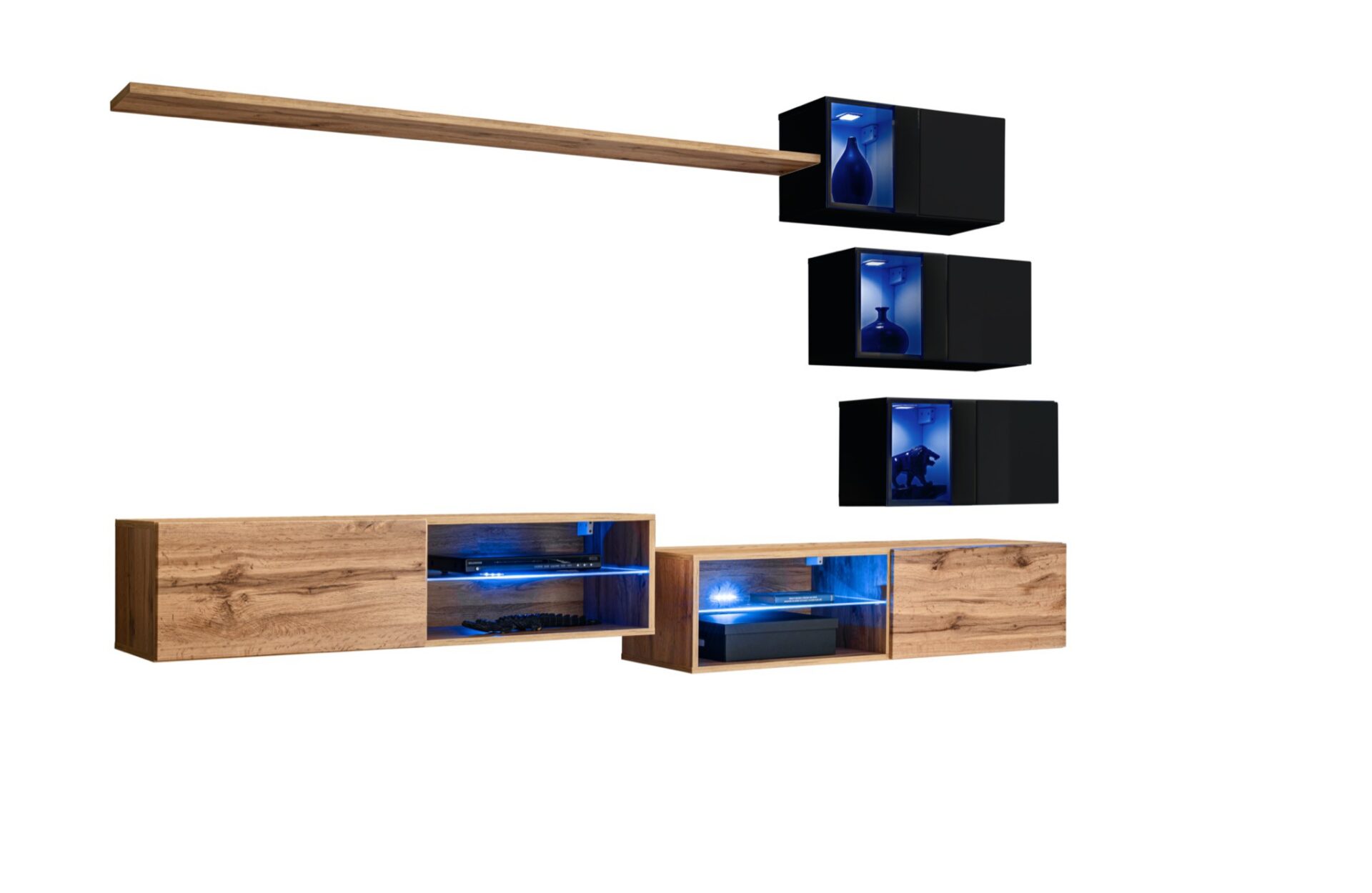 Prie sienos pakabinama lentyna. 3x Prie sienos pakabinamos spintelės: durelės su vienu skyriumi už jų. 3x Prie sienos pakabinamos vitrinos: iš dalies įstiklintos durelės su skyriumi už jų, apšviestu mėlynu LED apšvietimu. 2x Televizoriaus spintelės: skyrius su stikline lentyna, apšviesta mėlynu LED apšvietimu, šalia jo yra atvartas, kurį laiko dujinės atramos, ir atviras skyrius už jo. Priekinės dalys atidaromos spustelėjimo mechanizmu.