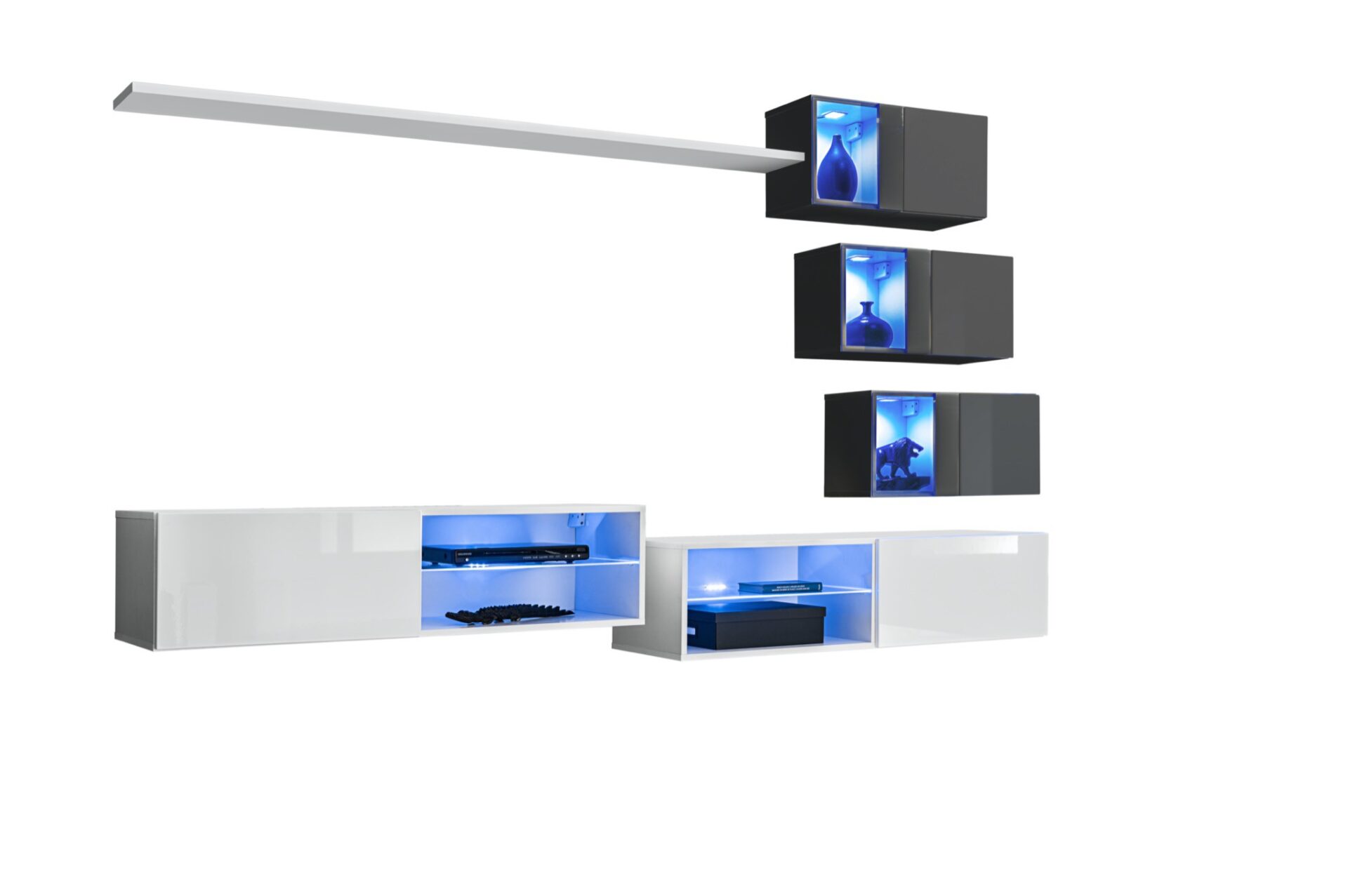 Prie sienos pakabinama lentyna. 3x Prie sienos pakabinamos spintelės: durelės su vienu skyriumi už jų. 3x Prie sienos pakabinamos vitrinos: iš dalies įstiklintos durelės su skyriumi už jų, apšviestu mėlynu LED apšvietimu. 2x Televizoriaus spintelės: skyrius su stikline lentyna, apšviesta mėlynu LED apšvietimu, šalia jo yra atvartas, kurį laiko dujinės atramos, ir atviras skyrius už jo. Priekinės dalys atidaromos spustelėjimo mechanizmu.