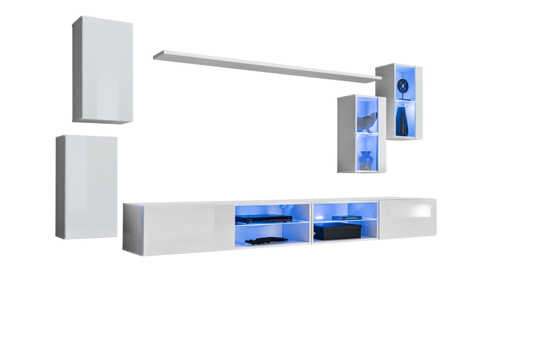 2x prie sienos tvirtinamos spintelės: durelės, už jų 1 standartinė lentyna (2 vietos). Lentyna. 2x prie sienos tvirtinamos vitrinos: iš dalies įstiklintos durelės, už jų skyrius su stikline lentyna, apšviesta mėlynu LED apšvietimu. 2x televizoriaus spintelės: skyrius su stikline lentyna, apšviesta mėlynu LED apšvietimu, šalia kurio yra atvartas, paremtas dujinėmis amortizatoriais, už kurio yra atviras skyrius. Priekinės dalys atidaromos spustelėjimo mechanizmu.