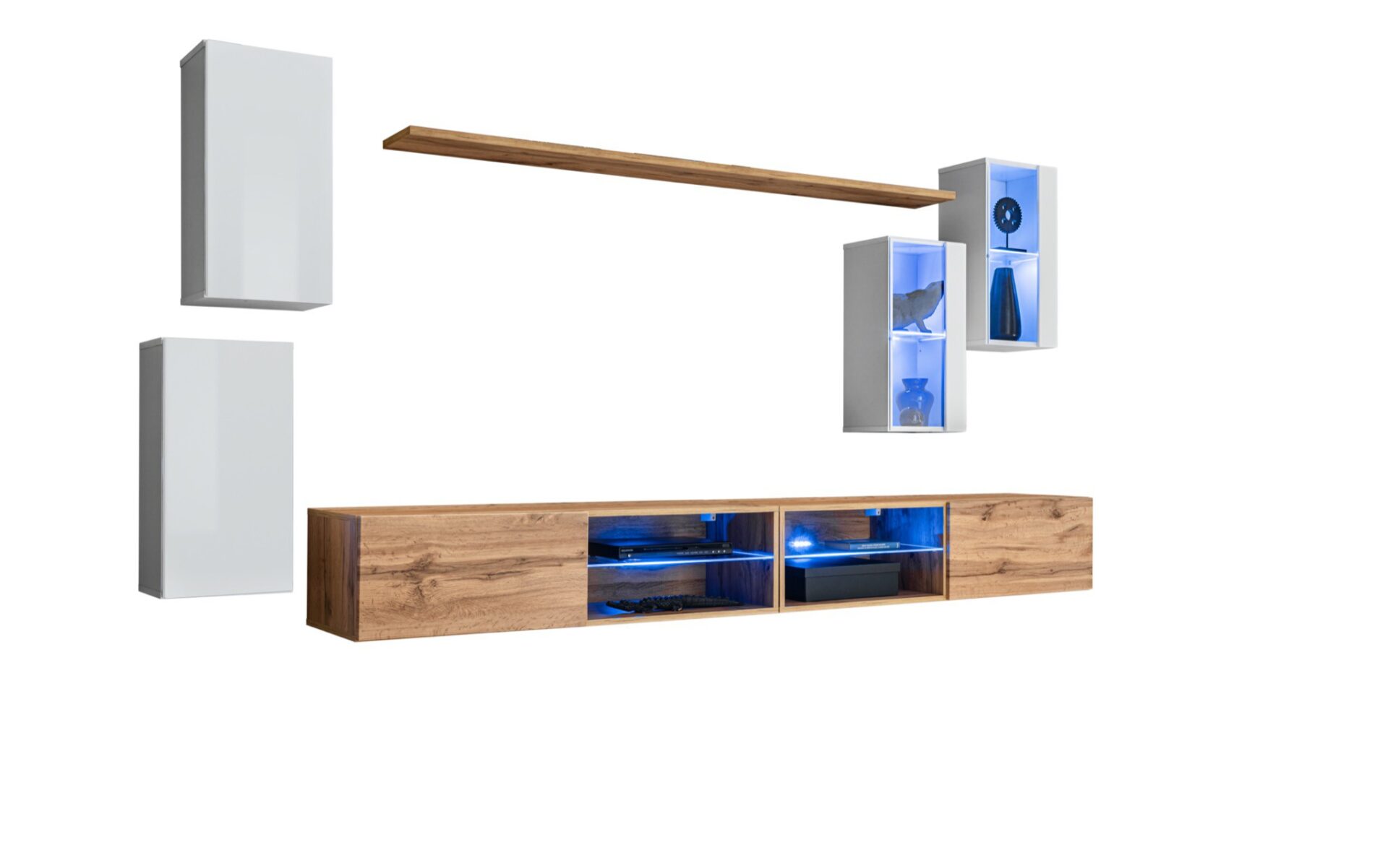 2x prie sienos tvirtinamos spintelės: durelės, už jų 1 standartinė lentyna (2 vietos). Lentyna. 2x prie sienos tvirtinamos vitrinos: iš dalies įstiklintos durelės, už jų skyrius su stikline lentyna, apšviesta mėlynu LED apšvietimu. 2x televizoriaus spintelės: skyrius su stikline lentyna, apšviesta mėlynu LED apšvietimu, šalia kurio yra atvartas, paremtas dujinėmis amortizatoriais, už kurio yra atviras skyrius. Priekinės dalys atidaromos spustelėjimo mechanizmu.