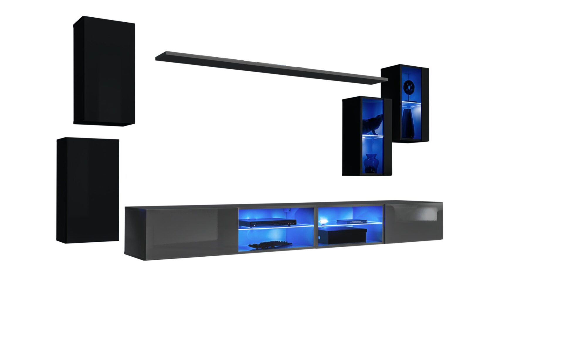 2x prie sienos tvirtinamos spintelės: durelės, už jų 1 standartinė lentyna (2 vietos). Lentyna. 2x prie sienos tvirtinamos vitrinos: iš dalies įstiklintos durelės, už jų skyrius su stikline lentyna, apšviesta mėlynu LED apšvietimu. 2x televizoriaus spintelės: skyrius su stikline lentyna, apšviesta mėlynu LED apšvietimu, šalia kurio yra atvartas, paremtas dujinėmis amortizatoriais, už kurio yra atviras skyrius. Priekinės dalys atidaromos spustelėjimo mechanizmu.