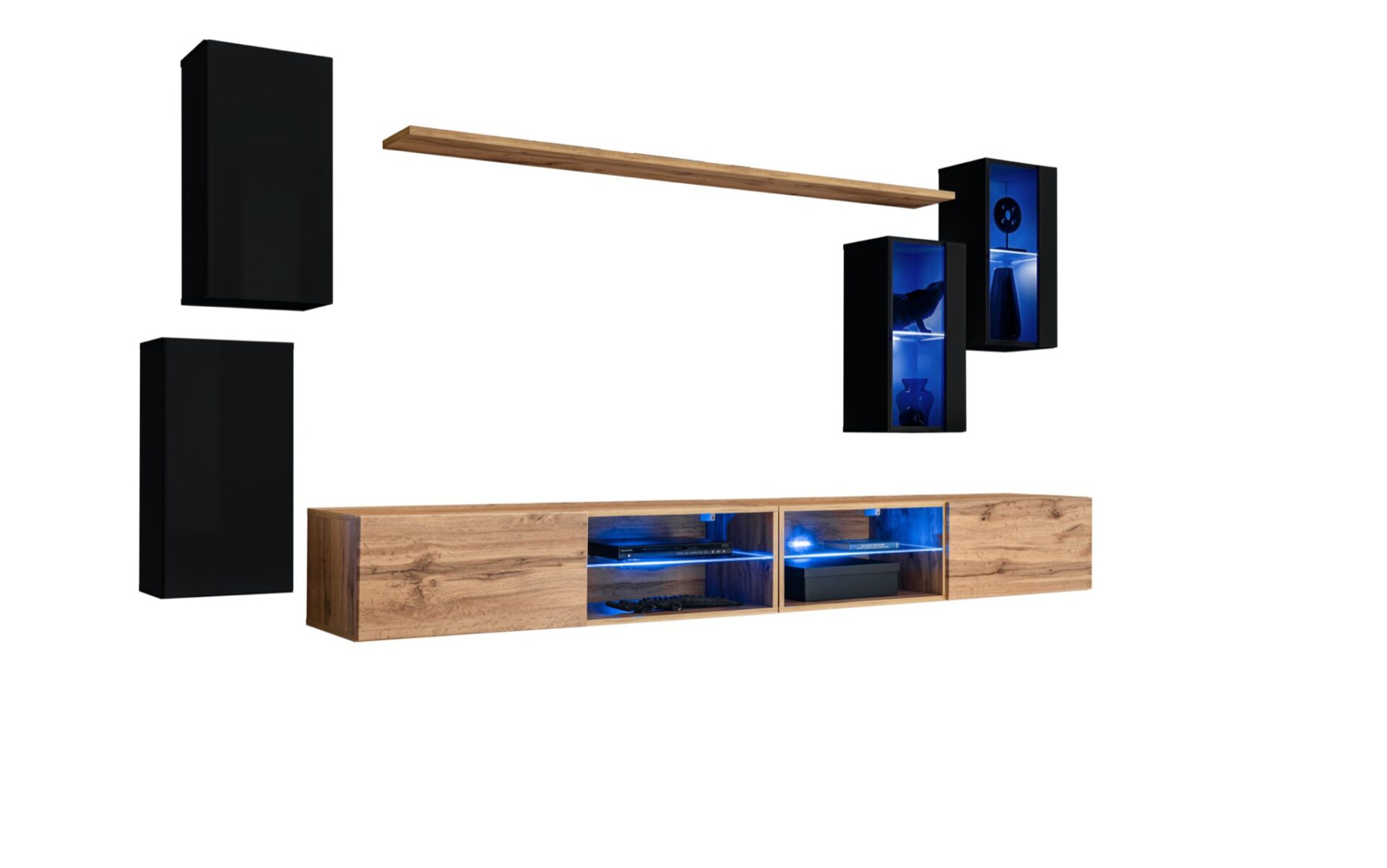 2x prie sienos tvirtinamos spintelės: durelės, už jų 1 standartinė lentyna (2 vietos). Lentyna. 2x prie sienos tvirtinamos vitrinos: iš dalies įstiklintos durelės, už jų skyrius su stikline lentyna, apšviesta mėlynu LED apšvietimu. 2x televizoriaus spintelės: skyrius su stikline lentyna, apšviesta mėlynu LED apšvietimu, šalia kurio yra atvartas, paremtas dujinėmis amortizatoriais, už kurio yra atviras skyrius. Priekinės dalys atidaromos spustelėjimo mechanizmu.