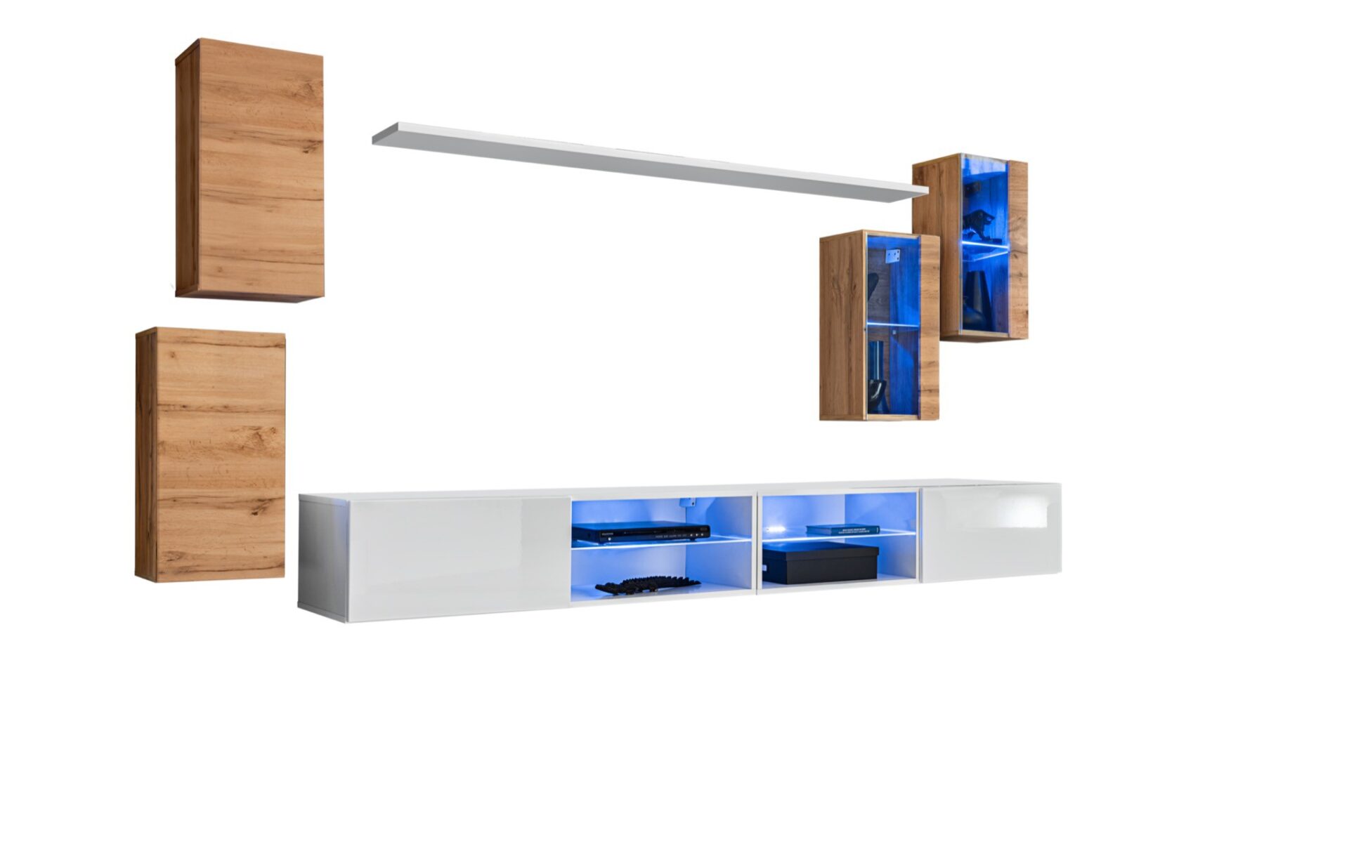 2x prie sienos tvirtinamos spintelės: durelės, už jų 1 standartinė lentyna (2 vietos). Lentyna. 2x prie sienos tvirtinamos vitrinos: iš dalies įstiklintos durelės, už jų skyrius su stikline lentyna, apšviesta mėlynu LED apšvietimu. 2x televizoriaus spintelės: skyrius su stikline lentyna, apšviesta mėlynu LED apšvietimu, šalia kurio yra atvartas, paremtas dujinėmis amortizatoriais, už kurio yra atviras skyrius. Priekinės dalys atidaromos spustelėjimo mechanizmu.