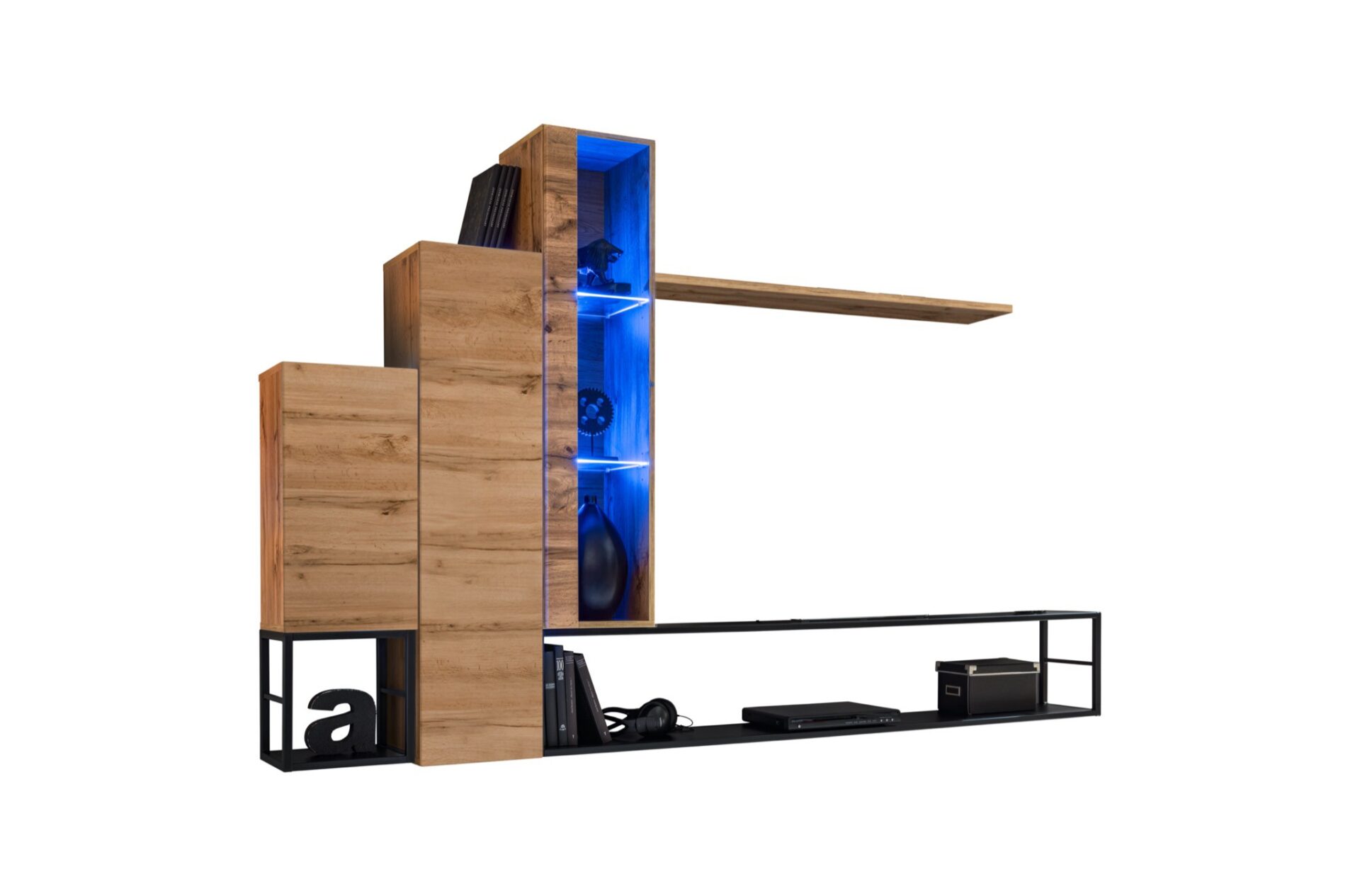 Pakabinama spintelė: durelės, viena lentyna už jų (2 tarpai). Pakabinama spintelė: durelės, dvi lentynos už jų (3 tarpai). Pakabinama vitrina: iš dalies įstiklintos durelės, dvi stiklinės lentynos už jų, apšviestos mėlynu LED apšvietimu. Lentyna. Maža metalinė lentyna: 2 lentynos. Ilga metalinė lentyna: 2 lentynos. Spragtelint atidaromi fasadai.