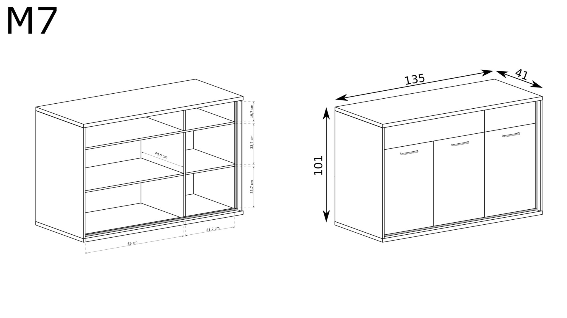 Komoda MEDIOLAN-7 – tai elegantiškas baldas, kuris suteiks jūsų interjerui unikalaus stiliaus ir patenkins visus jūsų daiktų laikymo poreikius. Pagaminta iš aukštos kokybės laminuotos plokštės, natūralios hikorijos spalvos, ji pasižymi moderniu ir estetišku dizainu. Dėl prislopintų spalvų ji puikiai tinka tiek svetainei, tiek miegamajam ar net paauglių kambariui. Ši komoda yra neįtikėtinai funkcionali, ją sudaro du stalčiai – vienas didesnis ir vienas mažesnis. Apatinėje dalyje yra erdvi spinta su dvigubomis ir viengubomis durimis, kuriose lengvai tilps visi jūsų daiktai. Išmaniai suprojektuotos pertvaros leidžia susisteminti daiktų laikymo vietas ir pritaikyti jas individualiems poreikiams, todėl tai idealus sprendimas bet kokiam interjerui. Stilingos juodos rankenėlės ir švelniai užsidarančios durelės suteikia modernumo, o metaliniai bėgeliai užtikrina patvarumą ir patogumą. Atidarymo stumiant sistema dar labiau palengvina atidarymą, todėl ja naudotis malonu. Minimalistinis dizainas puikiai dera prie dabartinių dekoravimo tendencijų, ypač palėpių išdėstyme.