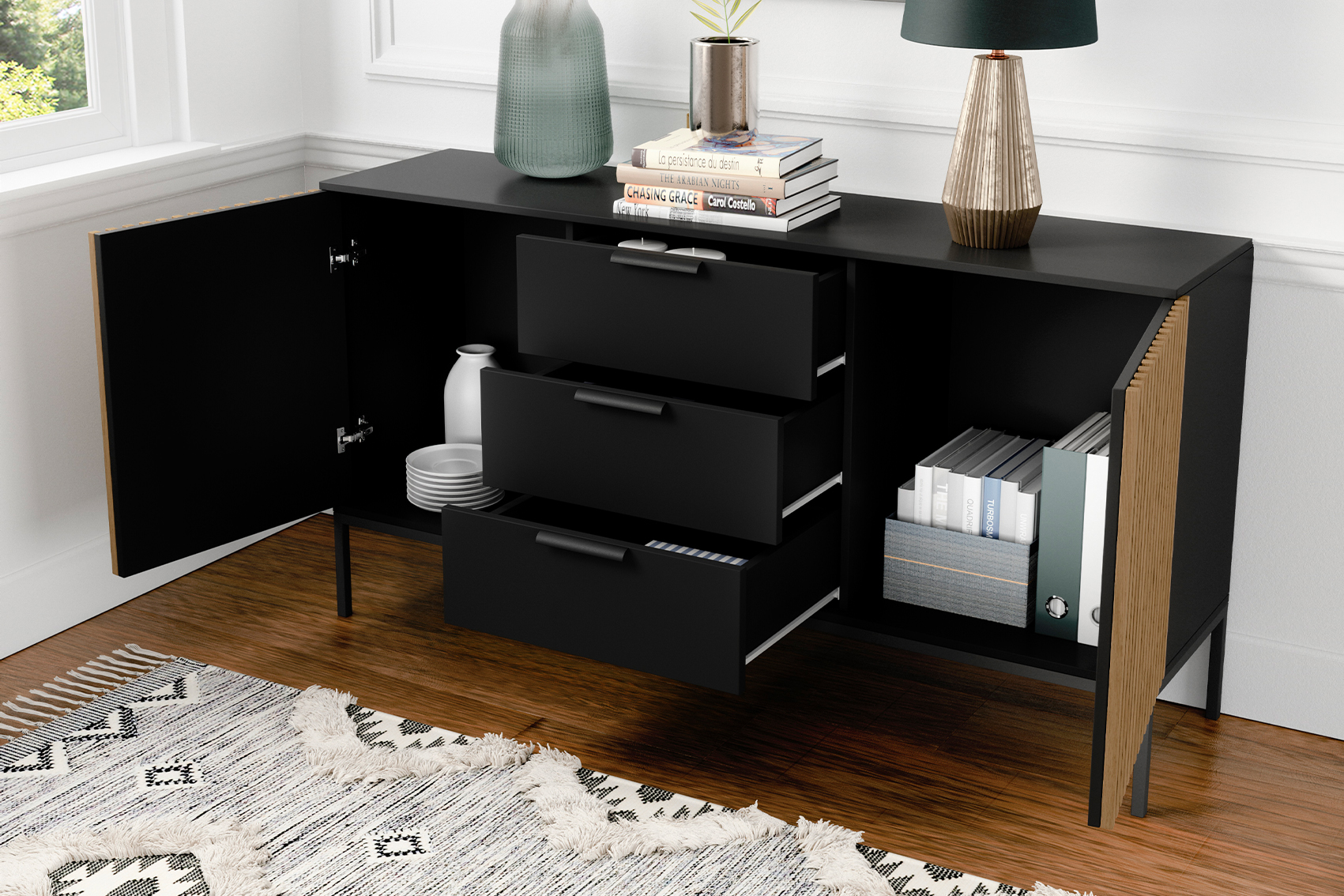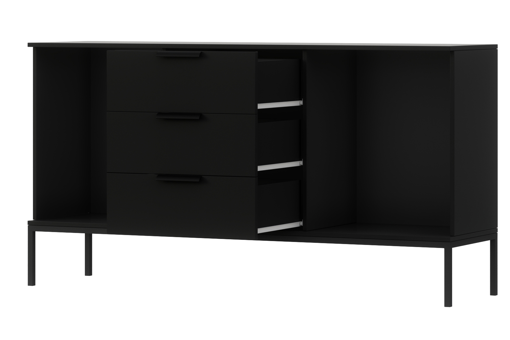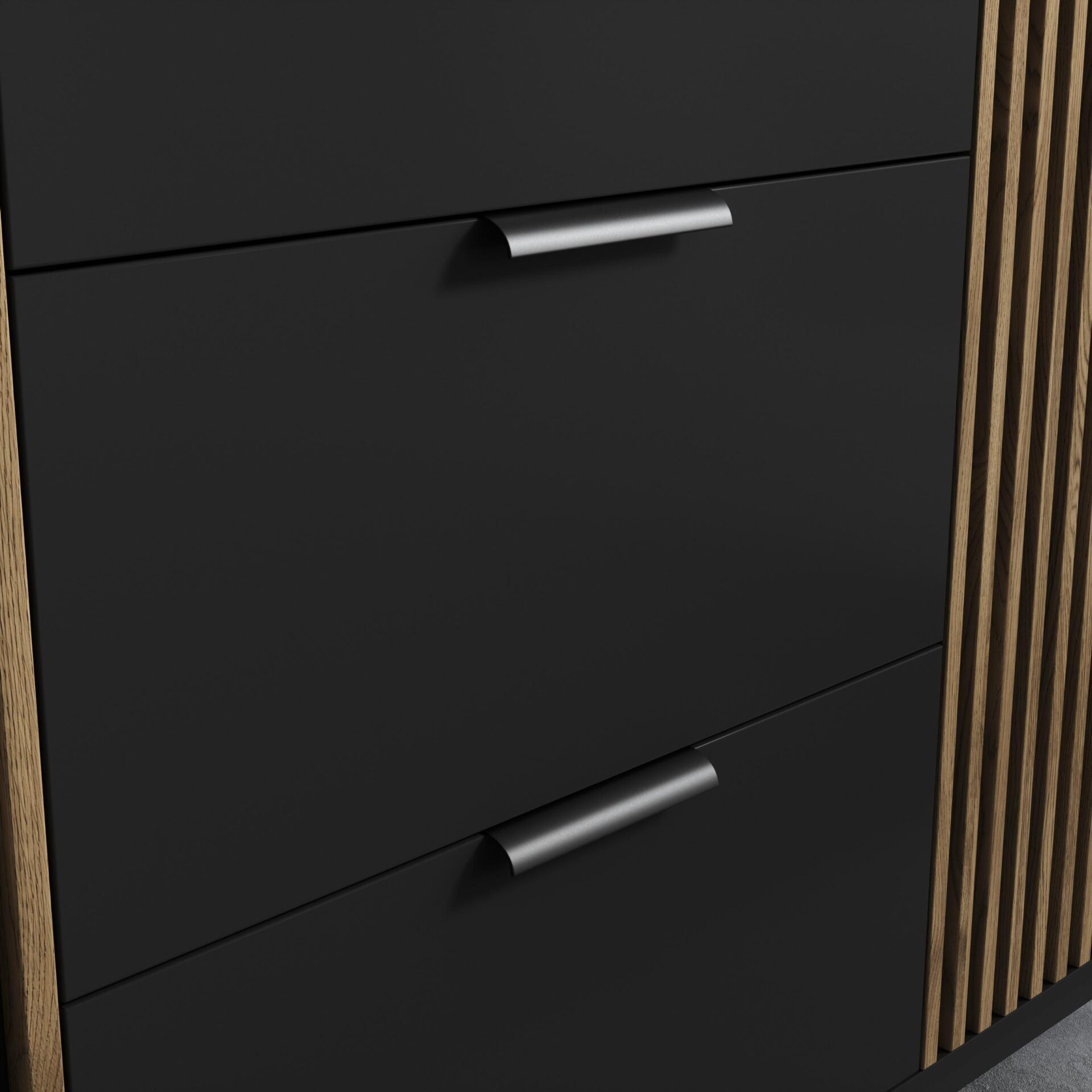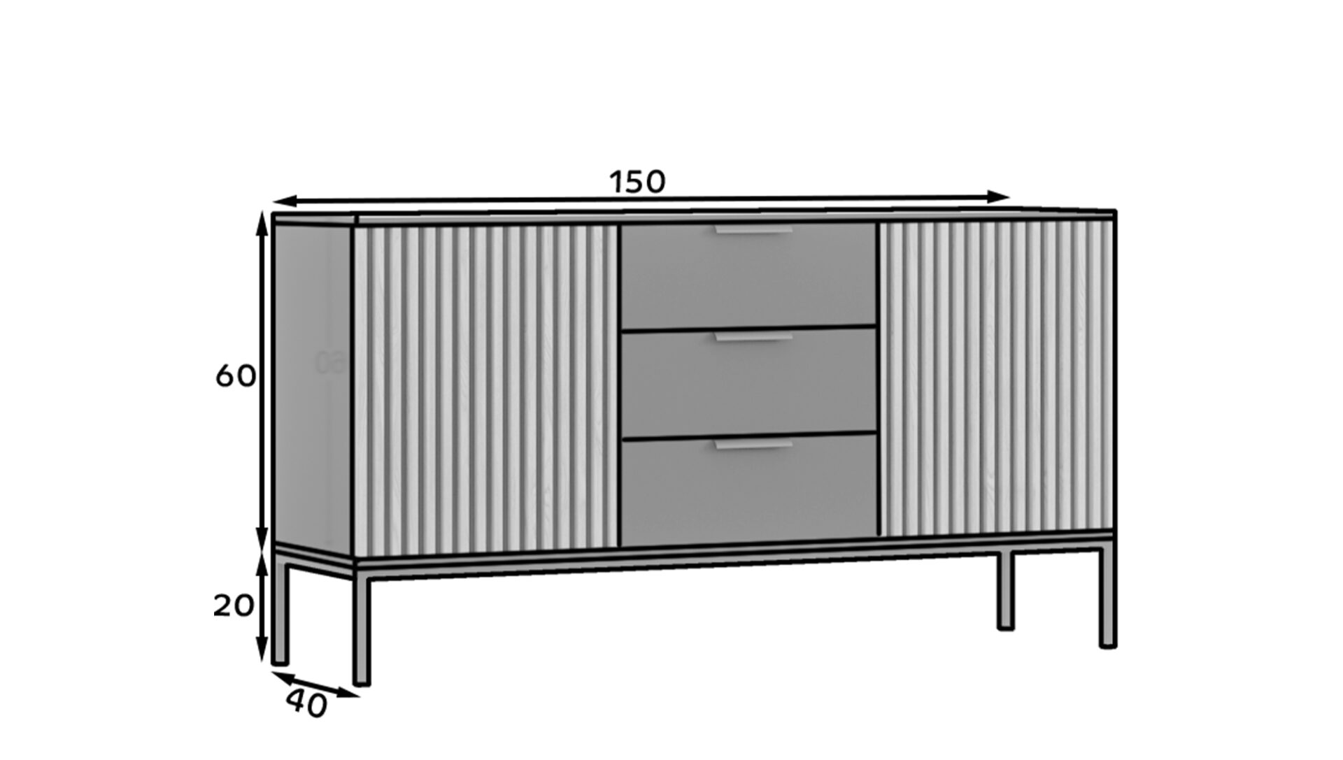 Juoda ’Meorati“ komoda – elegantiškas ir praktiškas baldas, puikiai papildantis modernų interjerą. Sukurta taip, kad būtų daug vietos daiktams susidėti, komoda yra 40 cm gylio, 150 cm pločio ir 80 cm aukščio, todėl joje yra daug vietos daiktams susidėti. Komoda turi dvejas dureles ir tris stalčius, todėl lengva susitvarkyti daiktus. Durelės pasižymi kontrastingomis, šviesiomis, frezuotomis fasadų sienelėmis, kurios suteikia unikalumo ir stiliaus. Komoda pagaminta iš aukštos kokybės plokštės, kuri yra patvari ir tvirta. Tiek stalčiai, tiek komoda yra apvaduoti ABS plastiku, kuris dar labiau padidina baldo ilgaamžiškumą ir apsaugo nuo pažeidimų. Komodos kojelės pagamintos iš metalo, užtikrinančio stabilumą ir tvirtą atramą. Jos yra 20 cm aukščio, todėl komoda šiek tiek kybo virš grindų, suteikdama jai lengvumo ir elegantiškumo. Lenta yra 16 mm storio, todėl konstrukcija tvirta. Dėl to komoda yra patvari ir ilgaamžė. Juoda „Meorati“ komoda yra ne tik funkcionalus baldas, bet ir elegantiškas bet kokio interjero papildymas. Juoda apdaila suteikia jai modernų vaizdą, kuris puikiai dera prie įvairių interjero stilių. Dėl didelės talpos ir praktiško išdėstymo „Meorati“ komoda bus puikus sprendimas įvairiems daiktams laikyti jūsų namuose.