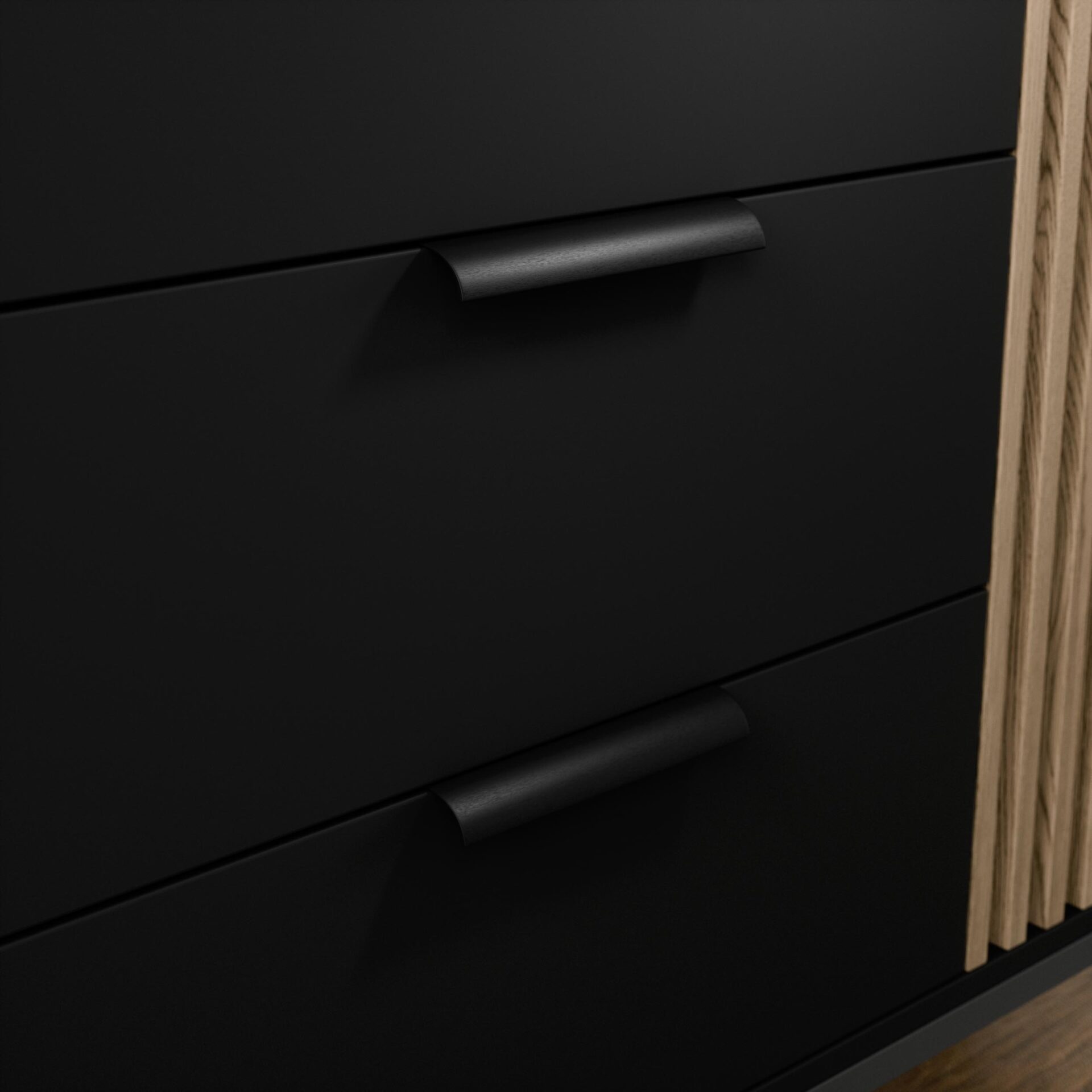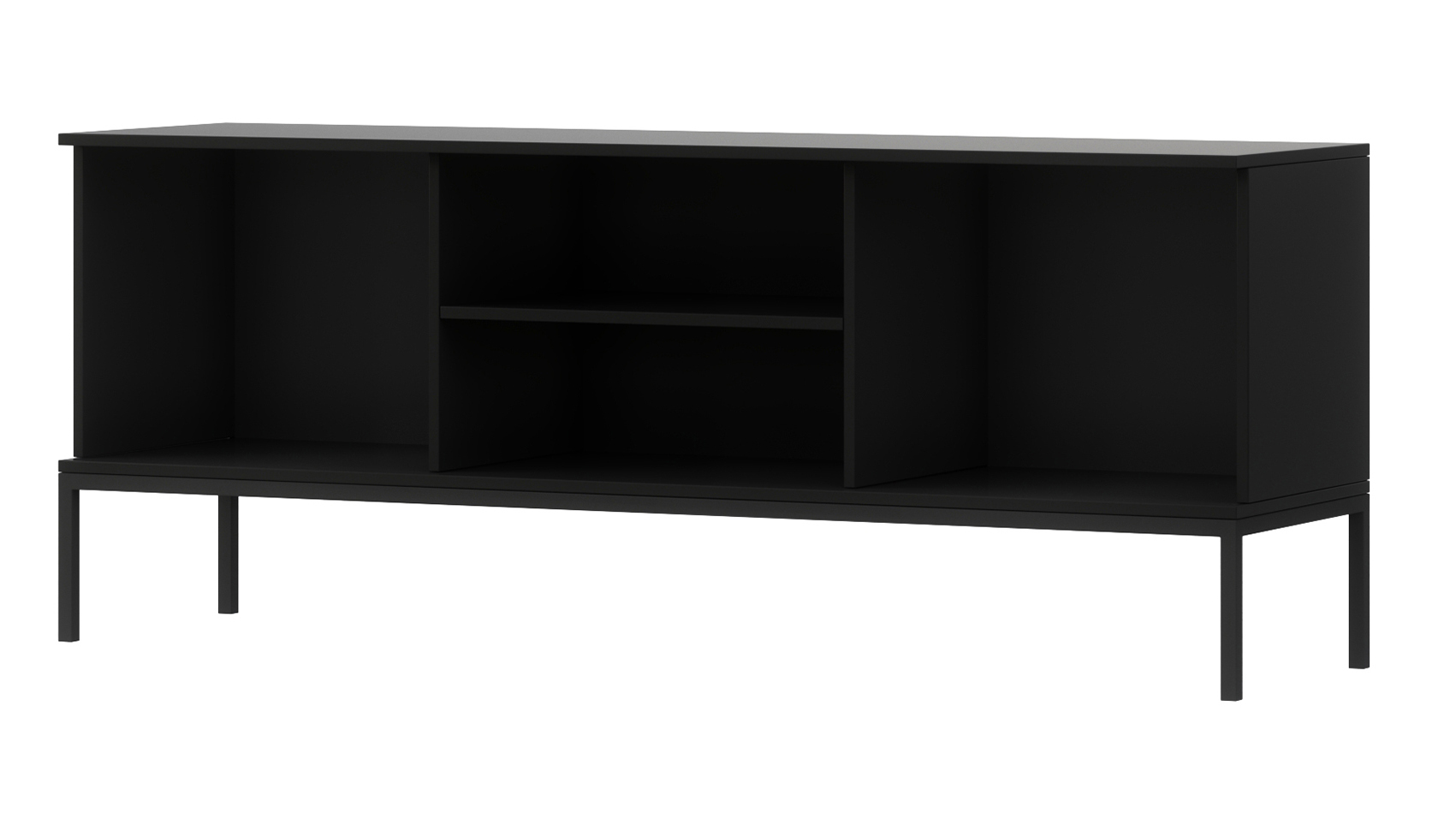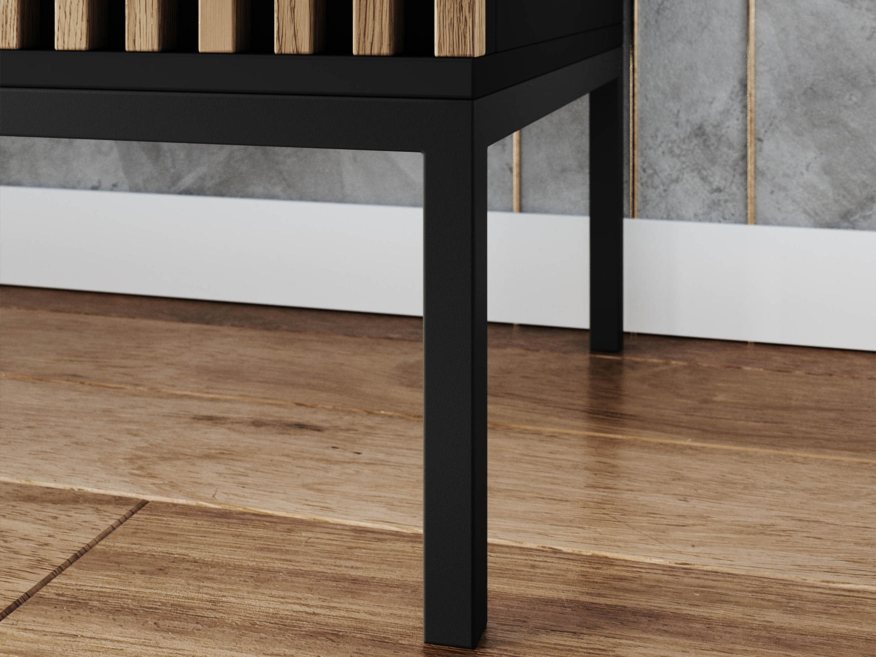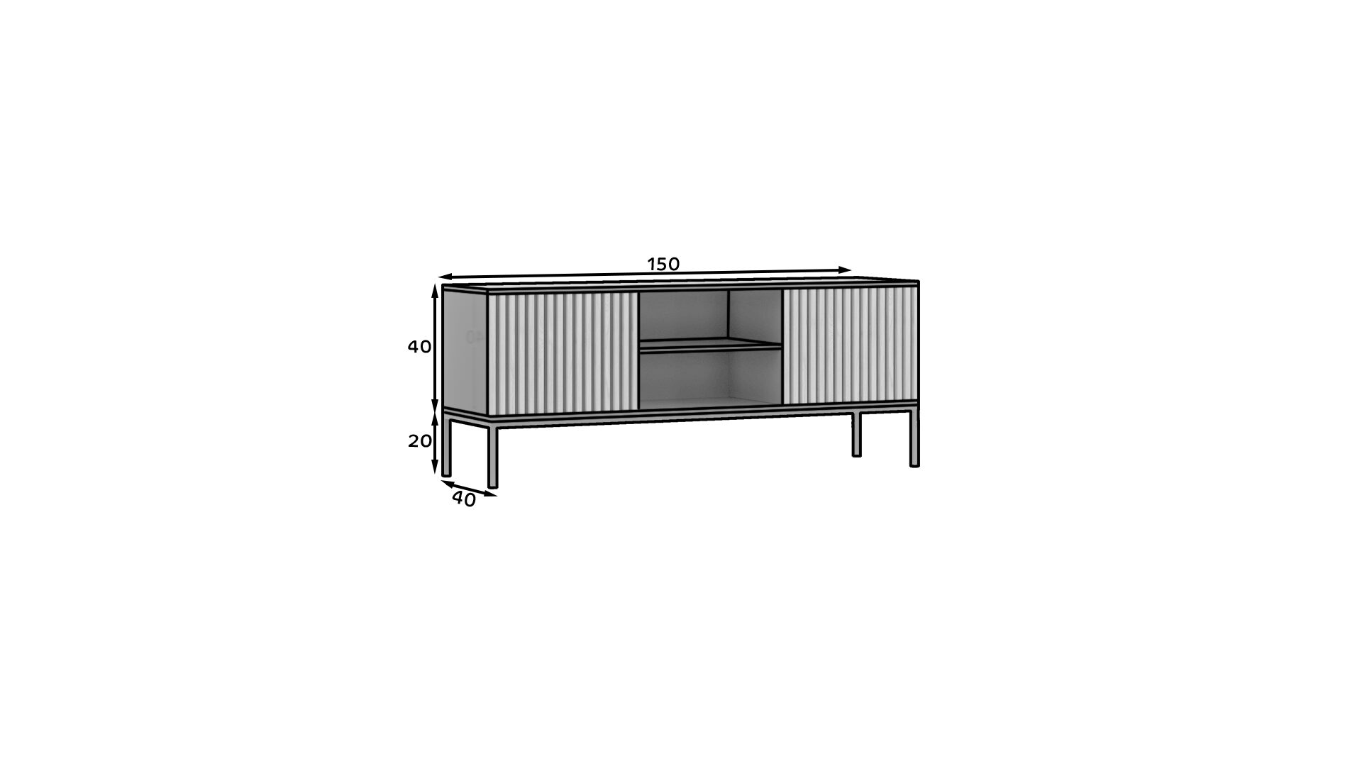 Juodas „Meorati“ laisvai pastatomas televizoriaus staliukas yra elegantiškas ir praktiškas baldas, puikiai patenkinsiantis jūsų elektronikos laikymo ir eksponavimo poreikius svetainėje ar pramogų kambaryje. Šis „Meorati“ televizoriaus staliukas, kurio gylis yra 40 cm, plotis 150 cm, o aukštis – 60 cm, suteikia daug vietos televizoriui, garso ir vaizdo įrangai bei kitiems priedams. Pagamintas iš patvarios 16 mm storio plokštės, staliukas pasižymi tvirta konstrukcija, kuri tarnaus ilgus metus. ABS apvadai, puošiantys stalčius ir spintelės korpusą, ne tik suteikia estetinio patrauklumo, bet ir apsaugo juos nuo pažeidimų. Ši detali apdaila suteikia „Meorati“ televizoriaus staliukui stilingą ir elegantišką išvaizdą, papildydama bet kokį interjerą rafinuotumu. „Meorati“ televizoriaus staliukas turi dvi atviras lentynas, kuriose patogu laikyti multimedijos įrangą ar dekoratyvinius daiktus. Be to, jame yra dvi lentynos su šviesios spalvos frezuotomis durelėmis, suteikiančiomis staliukui unikalų charakterį. Šios lentynos suteikia daugiau privatumo ir kartu dizainerio žavesio jūsų interjerui. 20 cm aukščio juodos metalinės kojelės suteikia „Meorati“ televizoriaus staliukui stabilumo ir vizualinio kontrasto. Juoda spalva dera su likusia spintelės dalimi, sukurdama darnų ir modernų stilių. Šis juodas ant grindų pastatomas „Meorati“ televizoriaus staliukas ne tik yra praktiškas sprendimas elektronikos laikymui, bet ir elegantiškas dekoratyvinis elementas, suteikiantis jūsų interjerui elegancijos ir funkcionalumo.